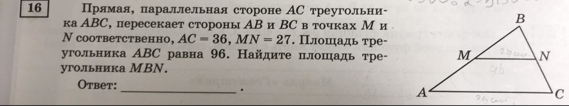 соот. Smbn/Sabc=(27/36)^2=9/16 => Smbn=9/16*96=54