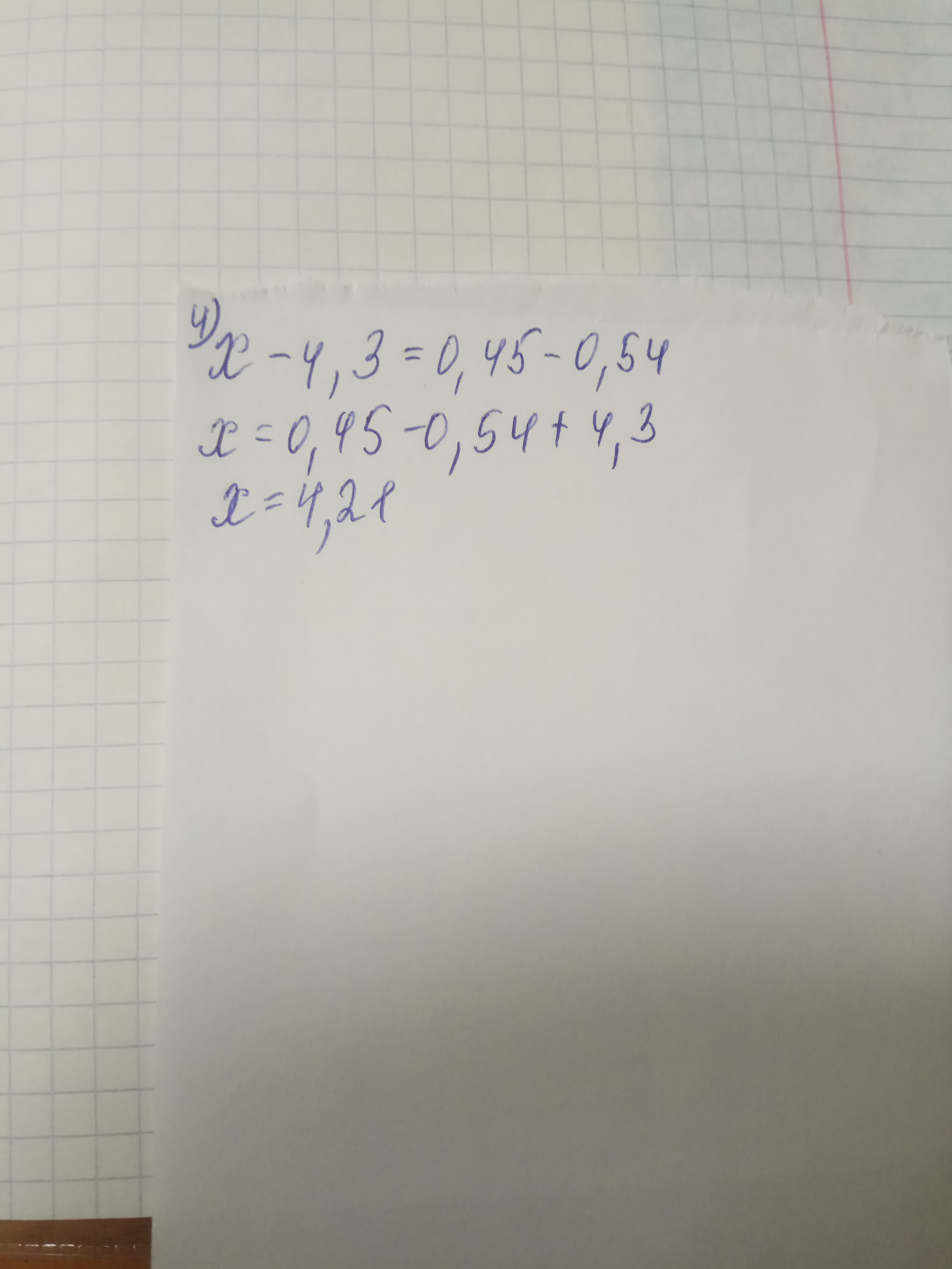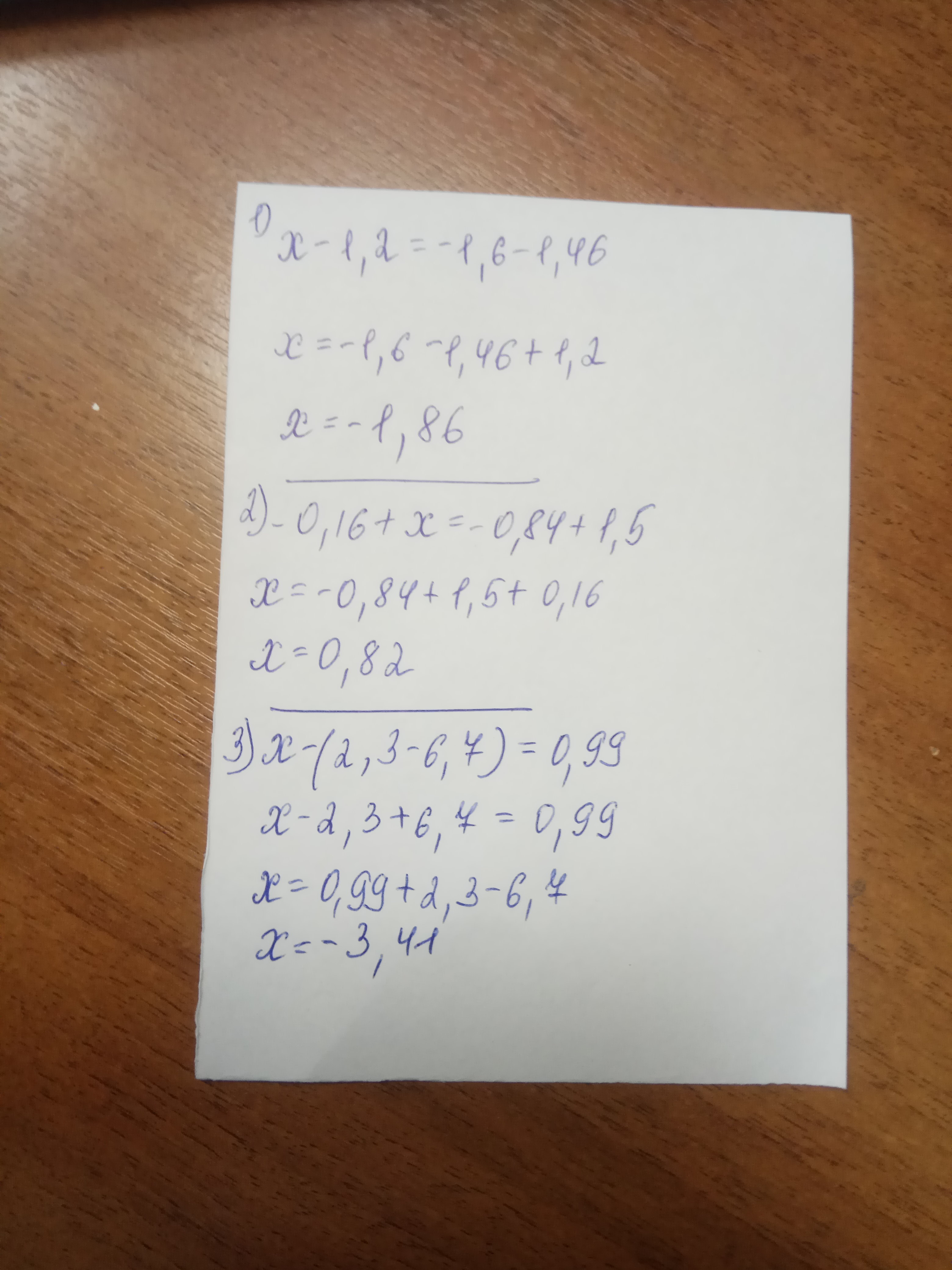 1) x - 1,2 = -1,6 - 1,46 2) -0,16 + x = -0,84 + 1,5 3) x - (2,3 - 6,7) = 0,99 4) x - 4,3 = 0,45 - 0,54