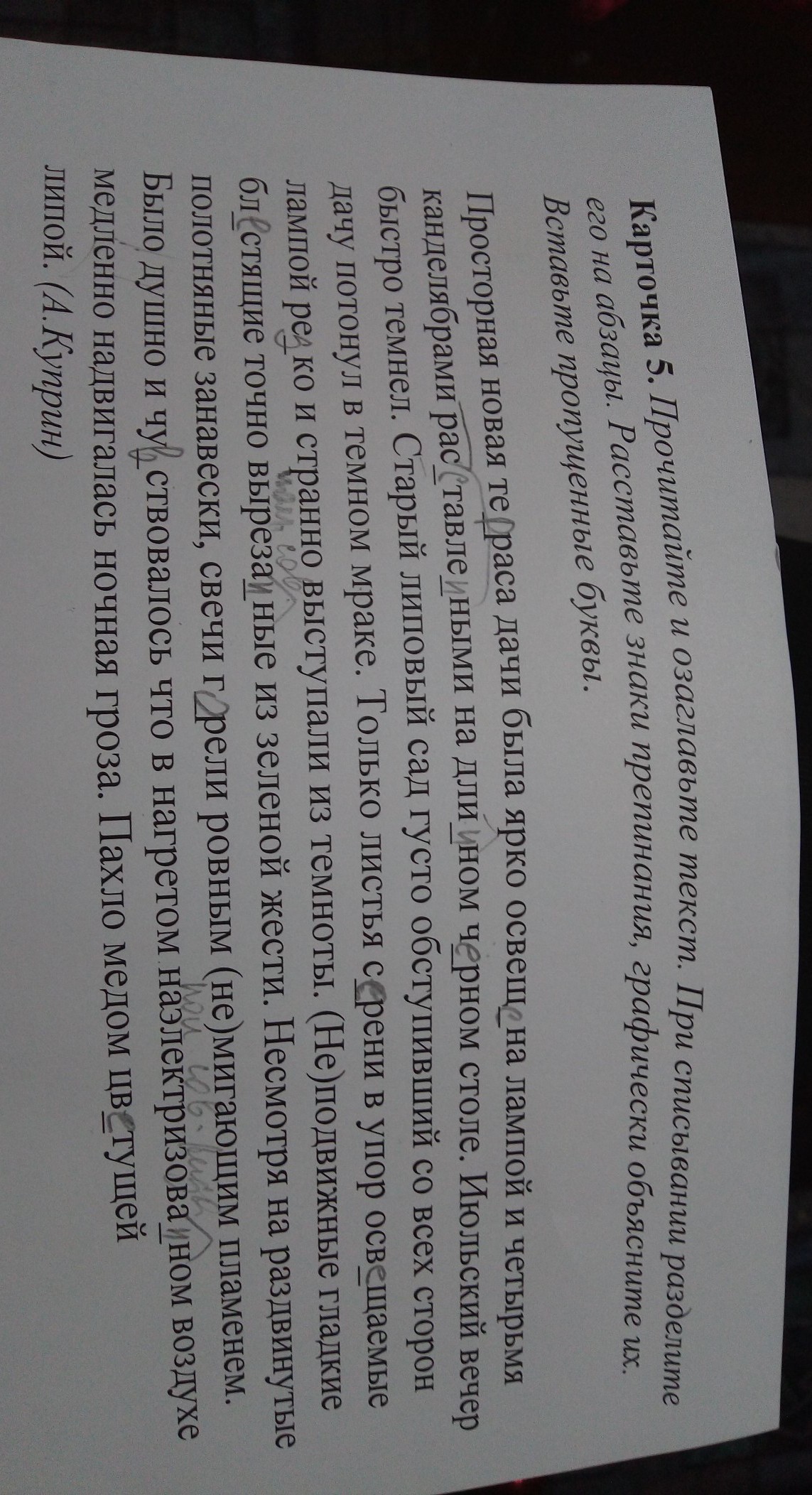 Июльский вечер быстро темнел. Старый липовый сад, /густо обступивший со всех сторон дачу/(ПО), потонул в теплом мраке. Только листья сирени, /в упор освещаемые лампой/(ПО), резко и странно выступали из темноты. Неподвижные, гладкие, блестящие (однородные определения), /точно вырезанные из зеленой жести/(ПО).