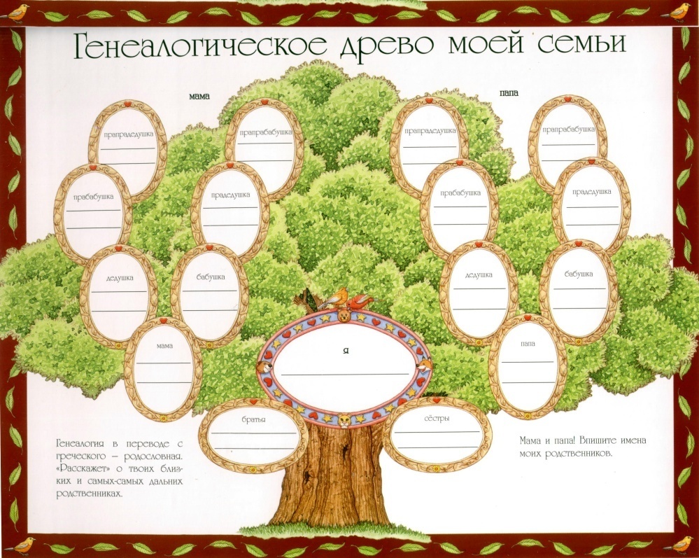 Пример генеалогического древа выглядит так, изобрази секматично и вписывай свой родственников