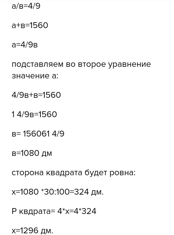 1) ширина и длина прямоугольника относятся как 4 : 9 а его периметр равен 1560 дм найдите периметр квадрата если его стороны составляет 30% ширины данного прямоугольника