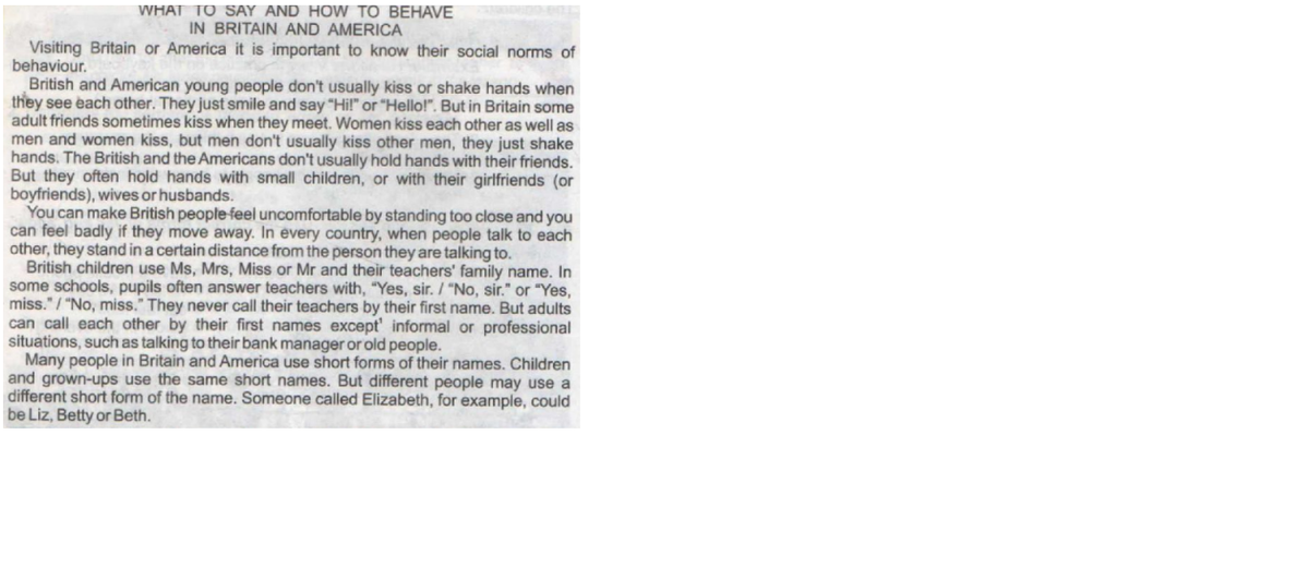 При посещении Англии и Америке необходимо знать их социальные нормы поведения. Британские и американские молодые люди не целуются и не трясут друг другу руки при встрече. Они просто улыбаются и говорят привет или здравствуй. Но в Англии некоторые взрослые люди целуются при встрече. Женщины целуют друг друга также как и мужчины целуют женщин, но мужчины не целуют друг друга, просто пожимают руки. Британцы и американцы не держат за руку друзей, держат за руку только маленьких детей, свою девушку (своего парня), жену и мужа.