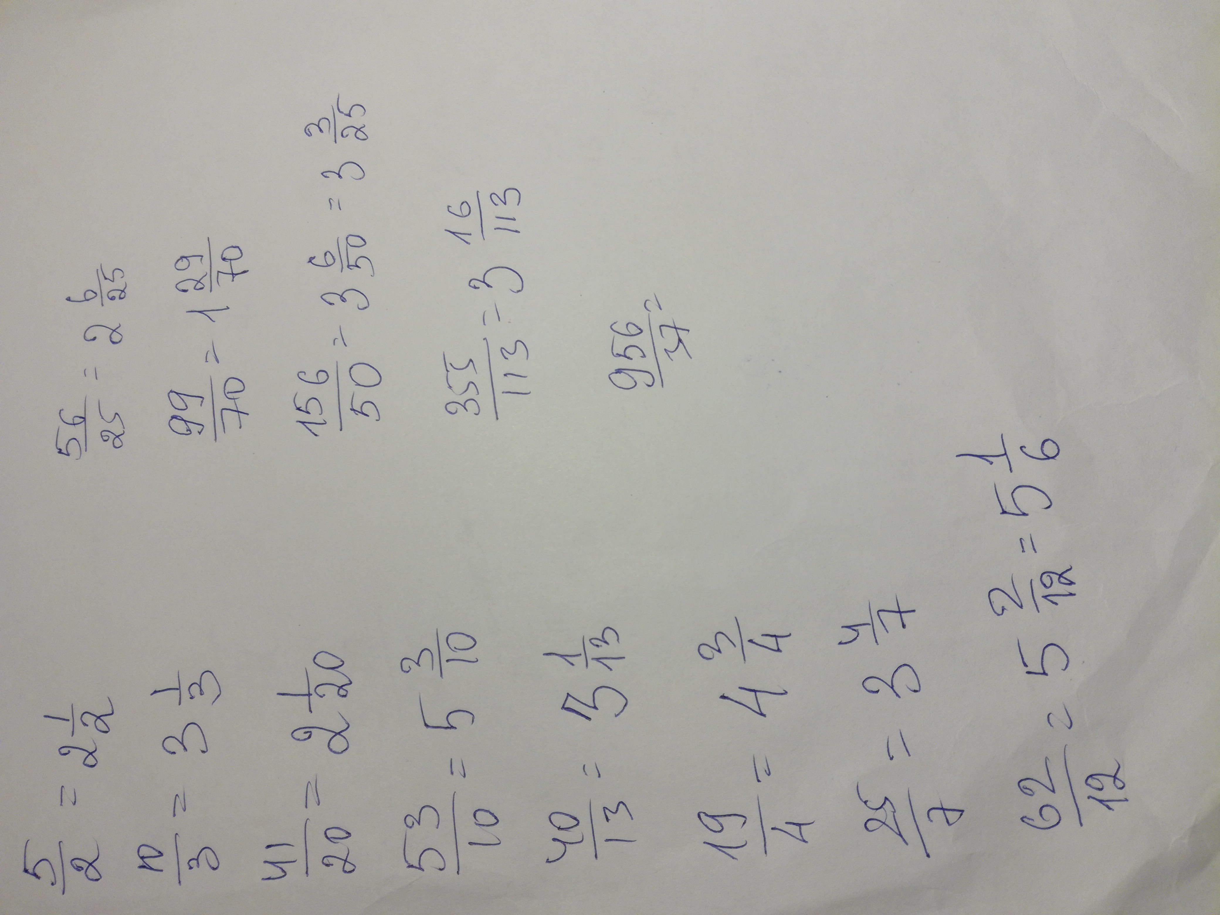 Запишите неправильную дробь в виде смешанного числа5/2, 10/3 ,41/20 ,53/10, 40/13 ,19/4 ,25/7 ,62/12, 56/25 ,99/70, 156/50 ,355/113 ,956/37