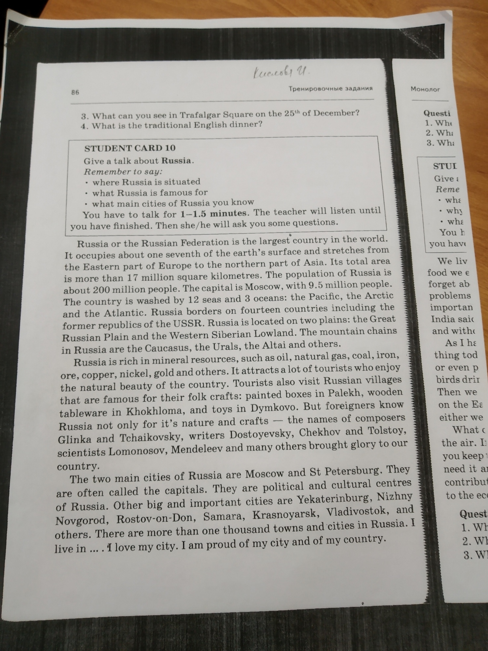 Поговорим о России. Не забудьте рассказать: •где находится Россия,•чем славится Россия,•какие главные города России вы знаете,вы должны говорить в течение 1-1,5 минут.Учитель будет слушать, пока вы не закончите. Затем она / он задаст вам несколько вопросов.