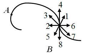 Введите цифру, соответствующую направлению ускорения тела в точке В. Тело движется по криволинейной траектории замедленно в сторону точки А