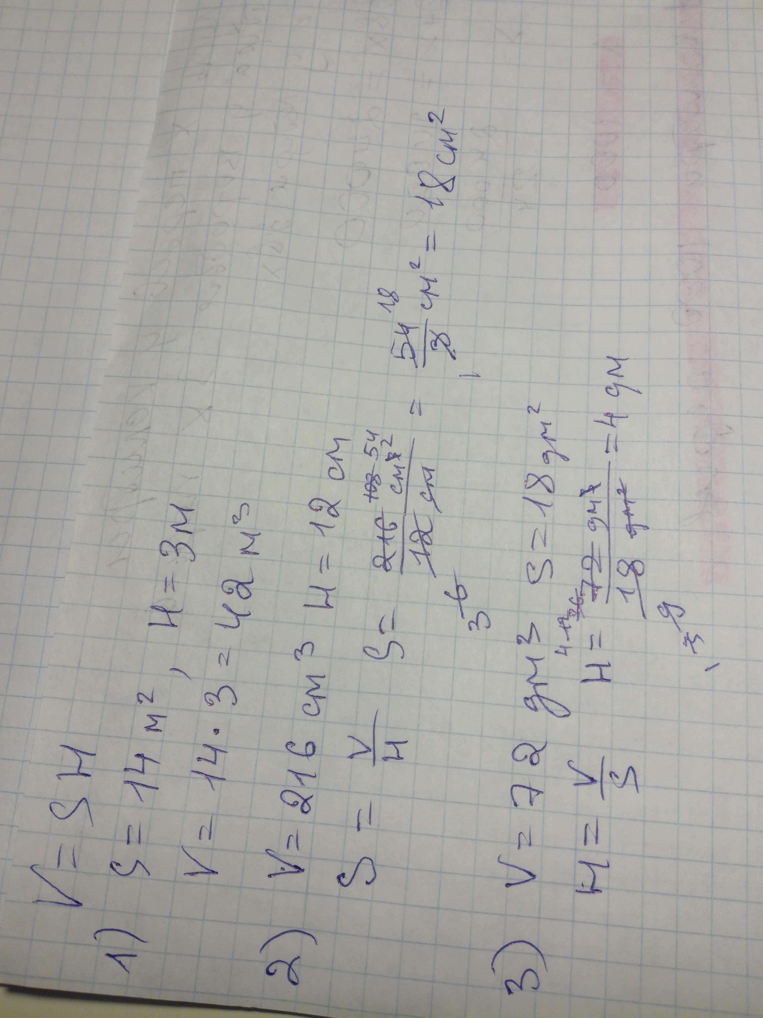 Пользуясь формулой объёма прямоугольного параллелепипеда V=SH,вычислите: 1) объём V,если S=14 м²,H=3 м 2) площадь S основания если V=216 см³,H=12 см 3) Высоту H,если V=72 дм³,S=18 дм²
