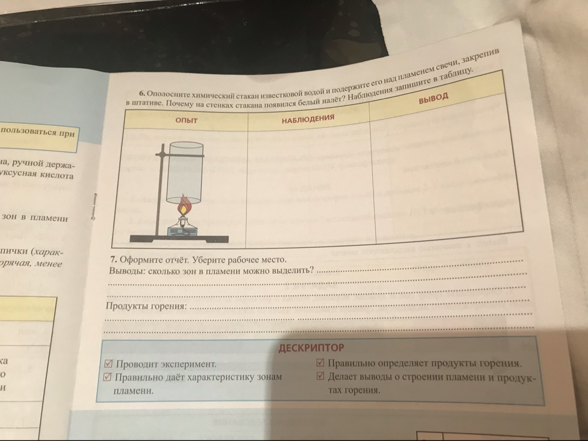 Наблюдения: закрепив на штативе химический стакан с известковой водой (Ca(OH)2) и подержав над пламенем на стенках стакана начинает появляться белый налёт оксида кальция CaO