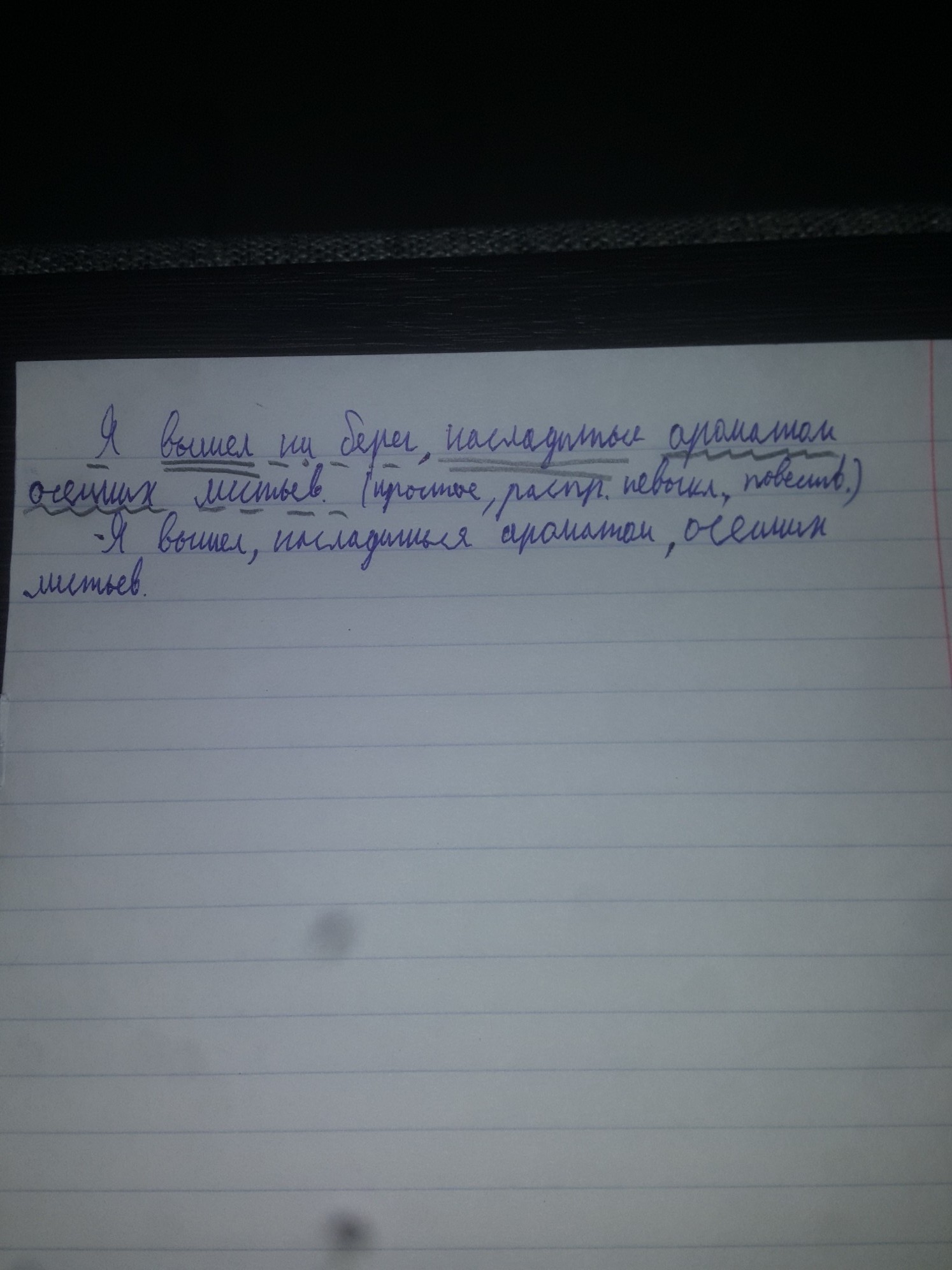 Помогите пожалуйста! 1) выполнить синтаксический разбор 2) выписать из этого предложения все словосочетания, указать вид связи. Я вышел на берег насладиться ароматом осенних листьев