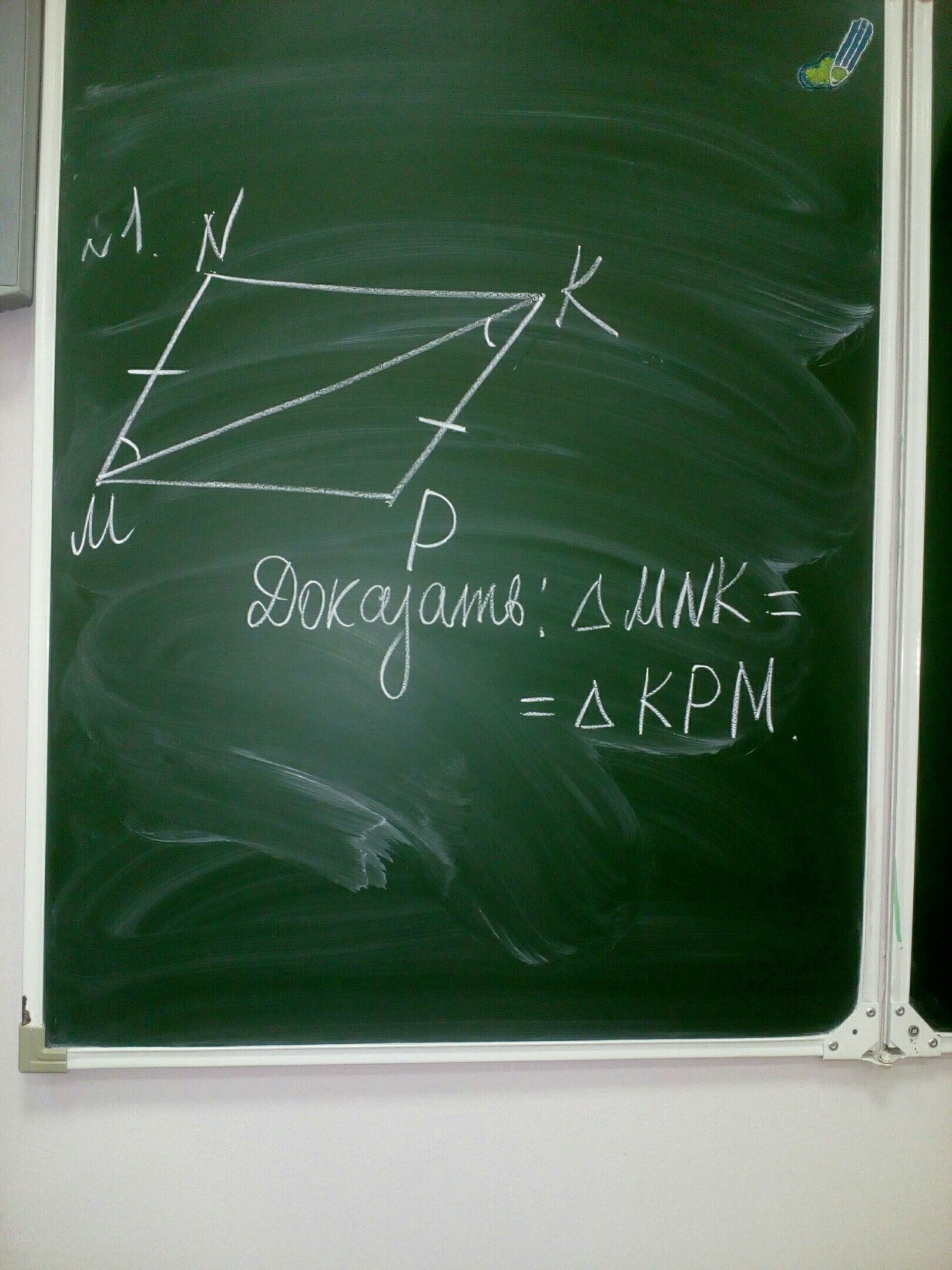 если MN=PK MK(общ.) то треугол MNK=KPM (по 1 теореме) если 2 стороны и угол между ними одного треугольника соответственно равны двум сторонам и углу между ними другог ттругольника, то такие треугол. равны.