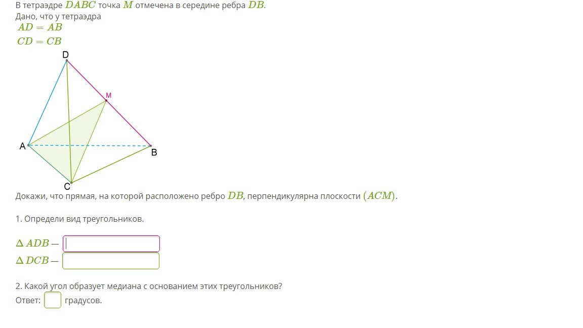 В тетраэдре DABC точка M отмечена в середине ребра DB.