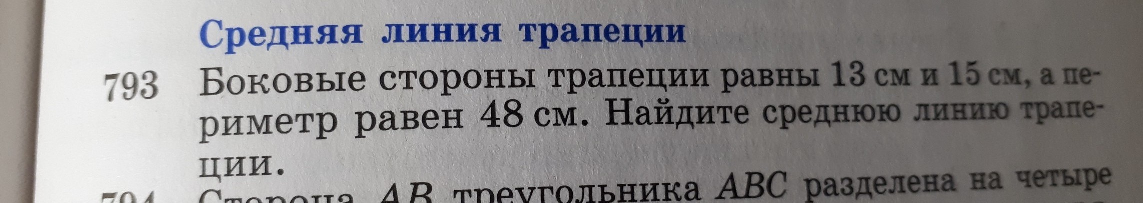 Значит, сумма оснований равна 20 см, теперь можем найти среднюю линию по формуле