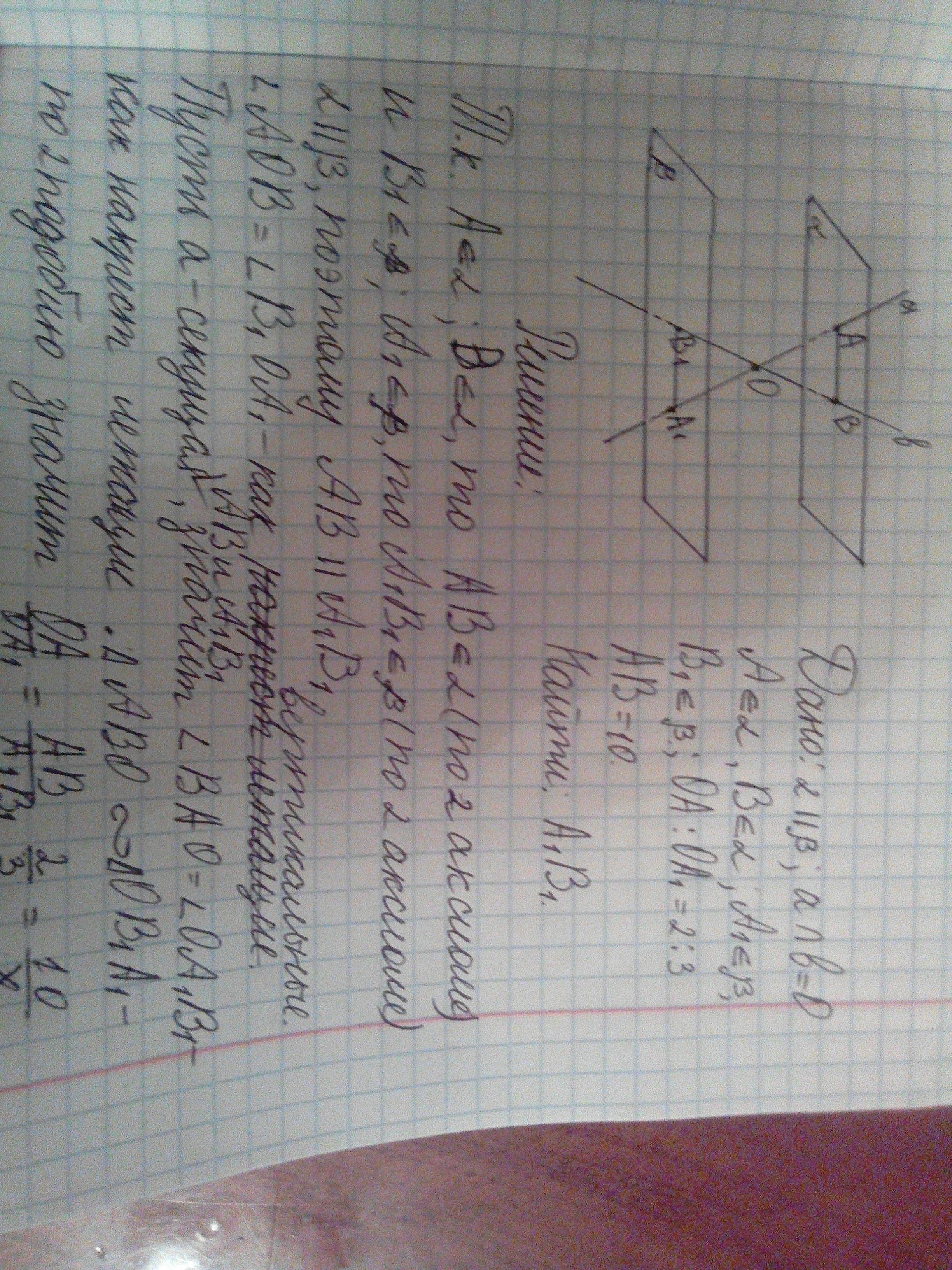 Плоскость альфа и бета параллельны.Через точку О, взятую между плоскостями альфа и бета,проведены 2 пересекающиеся прямые a и b. Прямая a пересекает плоскость альфа в точке A,плоскость бета - в точке A1,а прямая b пересекает плоскость альфа в точке B,плоскость бета - в точке B1. OA:OA1=2:3,AB=10. Вычислите A1B1/