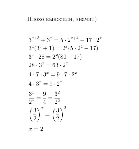 Мы можем разделить обе части уравнения на одно и то же выражение, которое не равно нулю. Делим, а затем используем свойства показательной функции — произведение степеней равно степени произведения