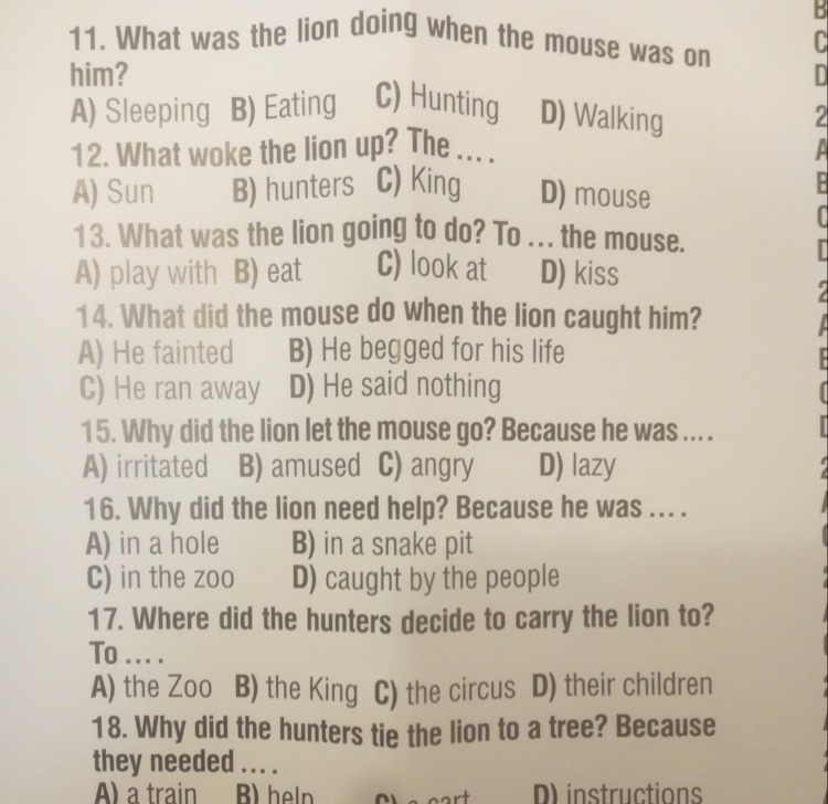 Once a Lion was asleep and a little Mouse began running up and down him. This soon woke the Lion, who placed his huge paw on the Mouse and opened his big jaws ready to swallow him.