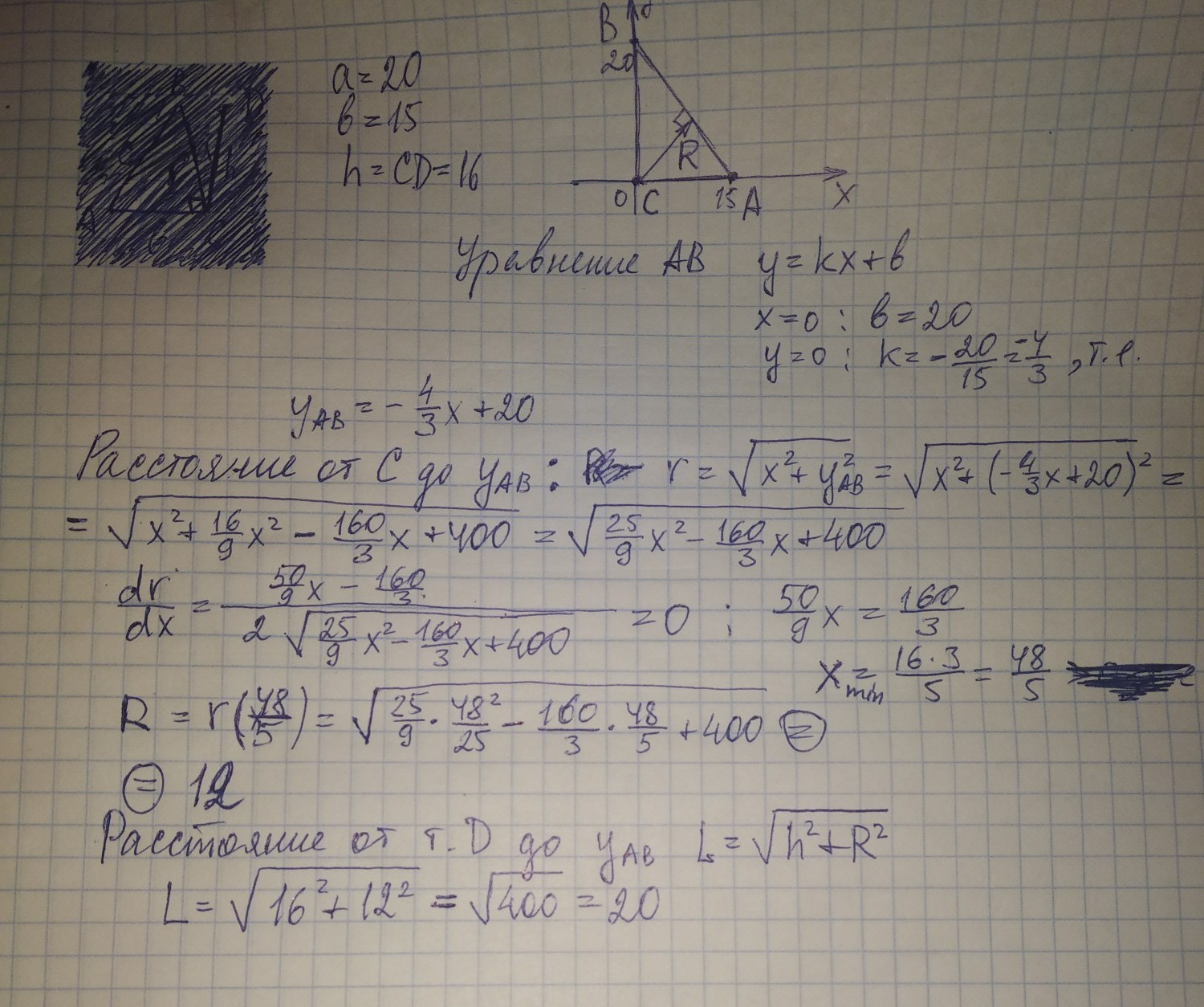 Катеты прямоугольного треугольника abc равны 15 и 20 из вершины прямого угла C проведён отрезок CД ПЕРПЕНДЕКУЛЯРНОЙ ПЛОСКОСТИ того треугольника СД=16 СМ найдите растояние от точки Д до гипотинузы АВ