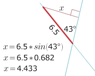 Две прямолинейные дороги пересекаются под углом 43.На одной из них в 6,5 км от развилки находится пункт,из которого проложен самый короткий путь до второй дороги.Найдите длину этого пути с точностью до 0,001 км.СРОООООЧЧЧЧЧЧННННННООООООО!5 Мин до урока