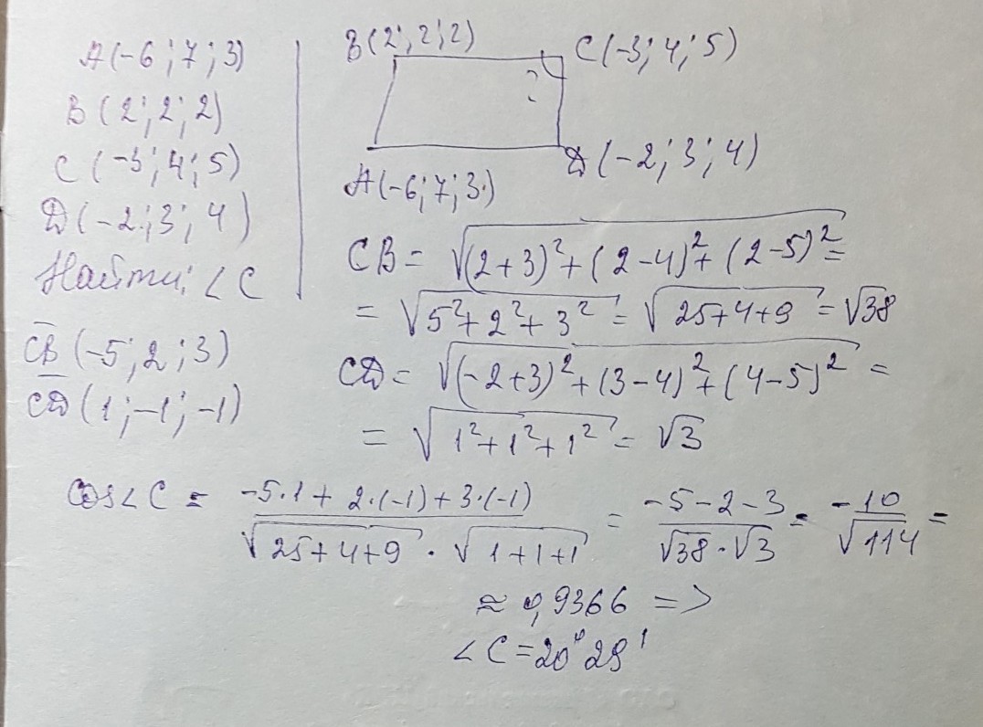 Помогите срочно! Точки: A(-6;7;3), B(2;2;2), C(-3;4;5), D(-2;3;4). Найдите ∠C