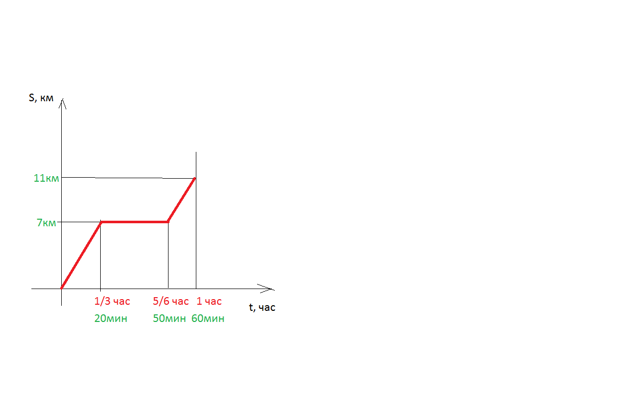 Велосипедист двигаясь равномерно в течение 20 мин, проехал 7 км. Затем в течение получаса он чинил велосипед. Следущие 10 мин велосипедист двигался со скоростью 24 км/ч. Постройте график зависимости пути от времени для движения велосипедиста и найдите среднюю скорость движения.