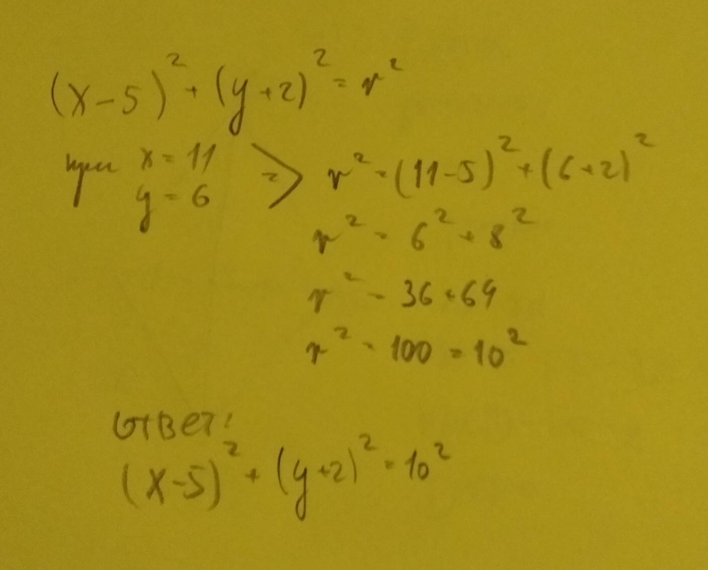 Напишите уравнение окружности с центром точке p(5;-2) проходящей через точку Q(11,6)