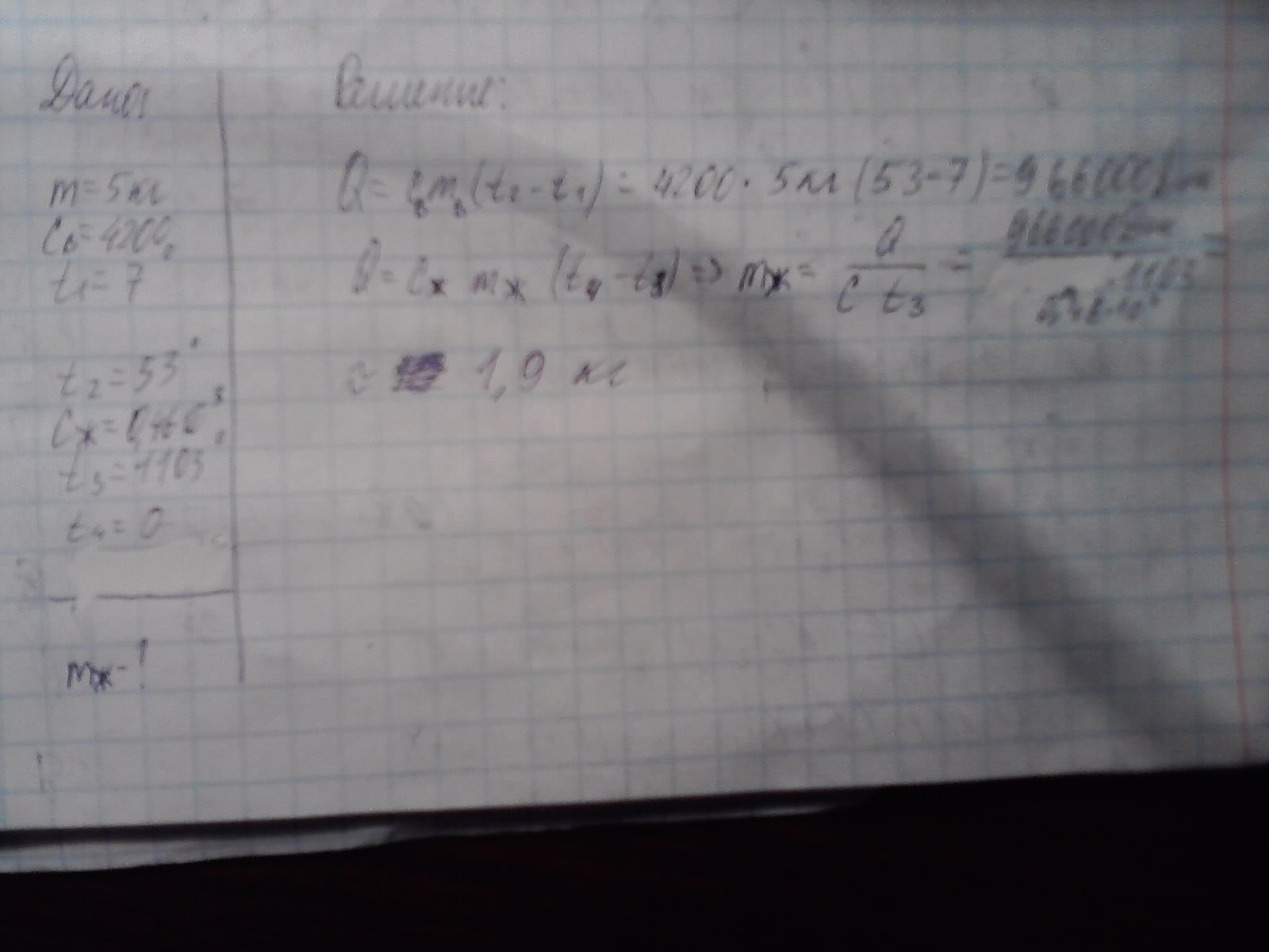 температура воды массой 5 кг. повысилась от 7градусов. до 53 после опускания в неё железной гири. Определите массу этой гири, если её начальная температура была 1103 градуса. Обменом энергии с окружающей средой пренебречь.