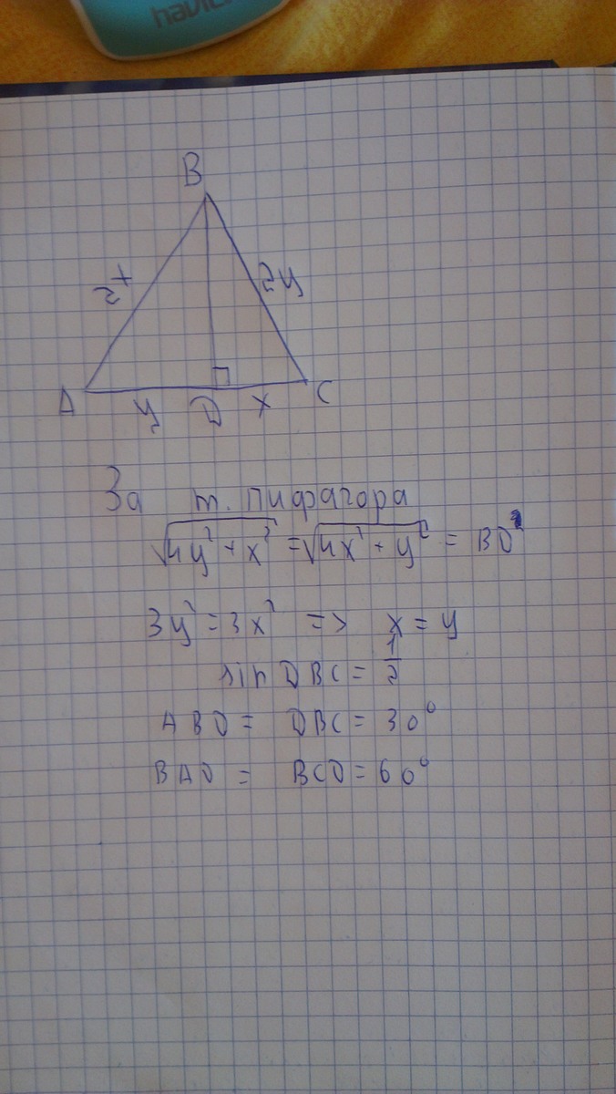 в треугольнике ABC проведена высота BD( то D лежит на стороне AC)Оказалось.что AB =2CD и CB =2AD.Найдите углы треугольника ABC.