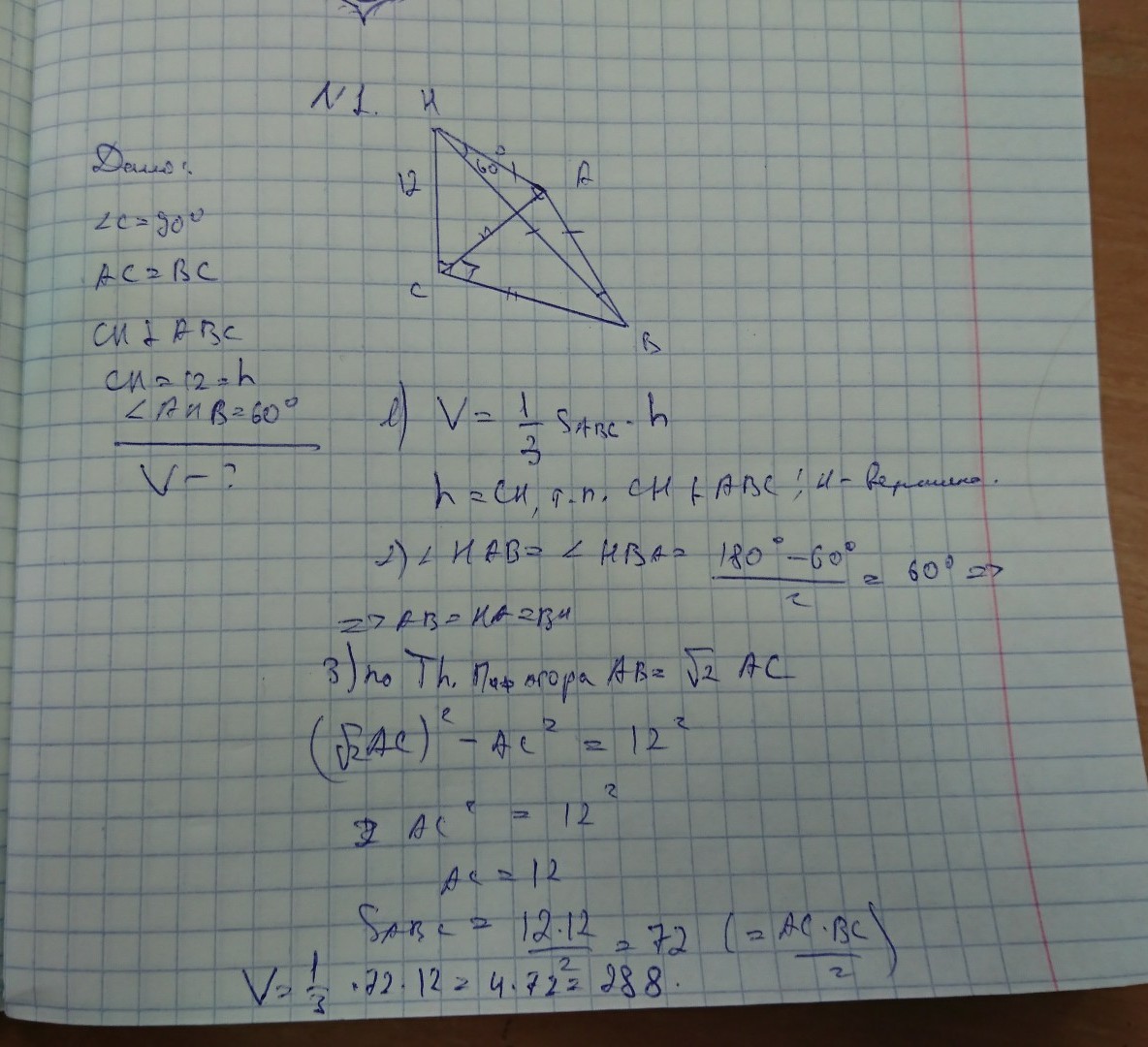 в основании пирамды лежит равнобедренный треугольник с углом 90° при вершине. одно боковое ребро пирамиды перпендикулярно к плоскости основания, а два других - равны и образуют между собой угол 60°. вычислить объем пирамиды, если высота 12 см.