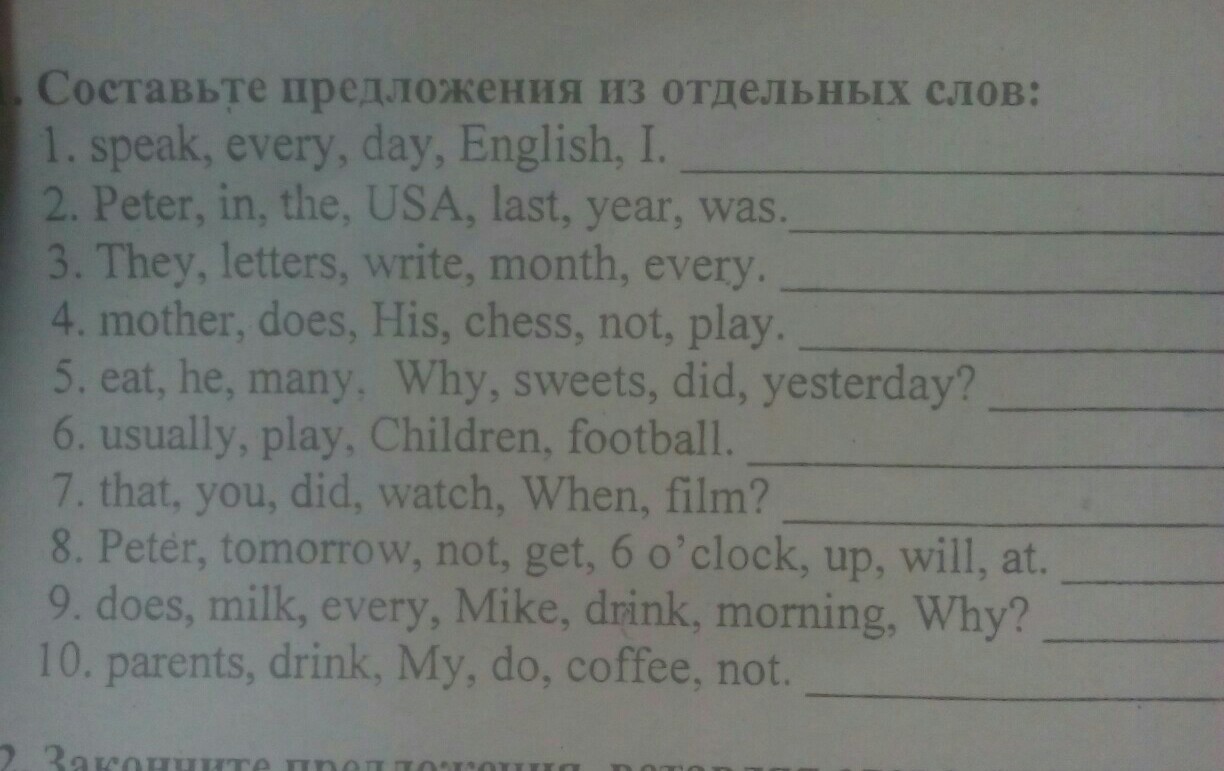 1.I speak English every day.2.Peter was in the USA last year.3.They write letters every month.4.His mother does not play chess.5.Why did he eat many sweets yesterday.6.Children usually play football.7.When did you watch that film?8.Tomorrow Peter will not get up at 6 o'clock.9.Why does Mike drink milk every morning?10.My parents do not drink coffee.