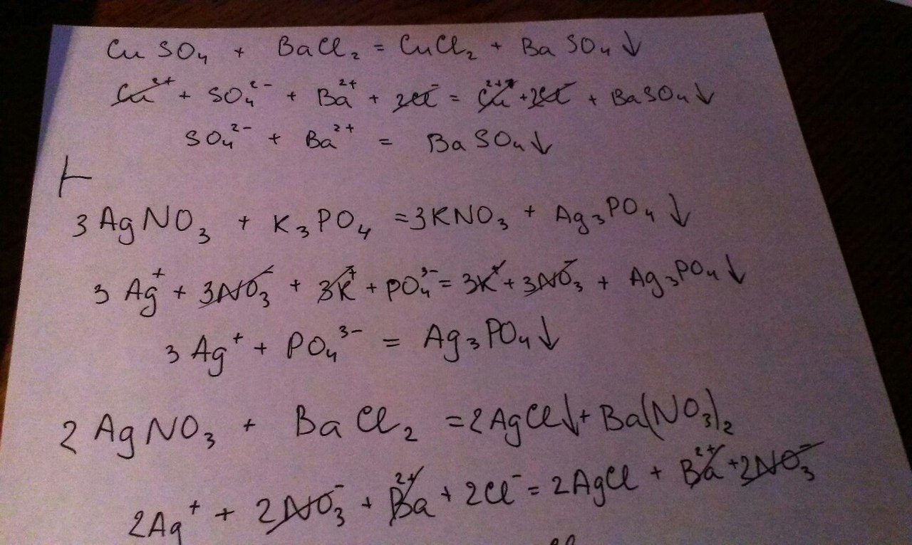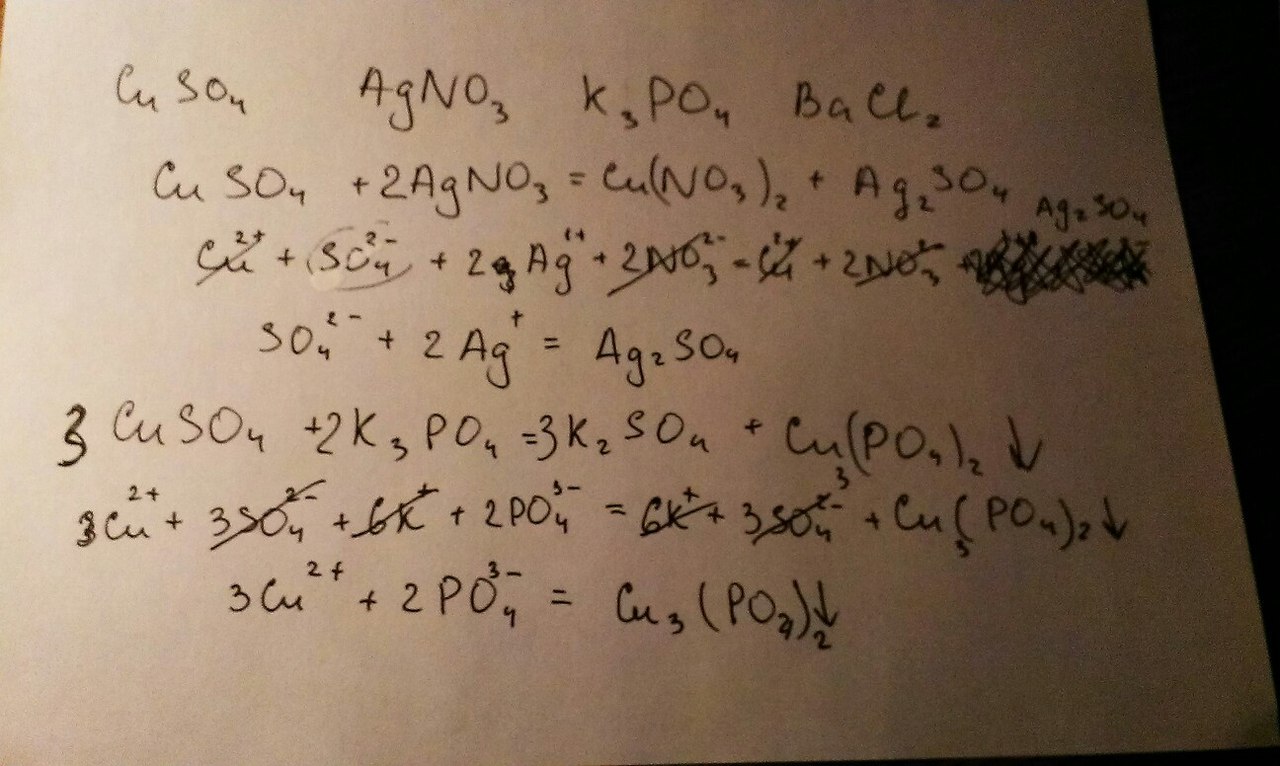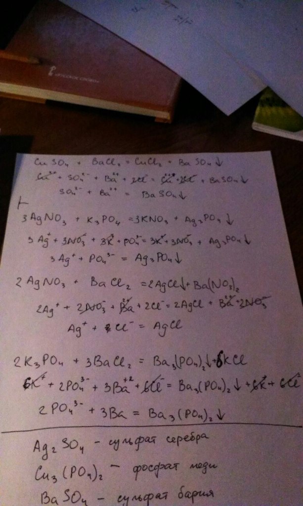 какие соли можно получить имея cu so4 AgNO3 K3PO4 BaCl2.написать уравнения в ионно молекулярном виде и назвать их