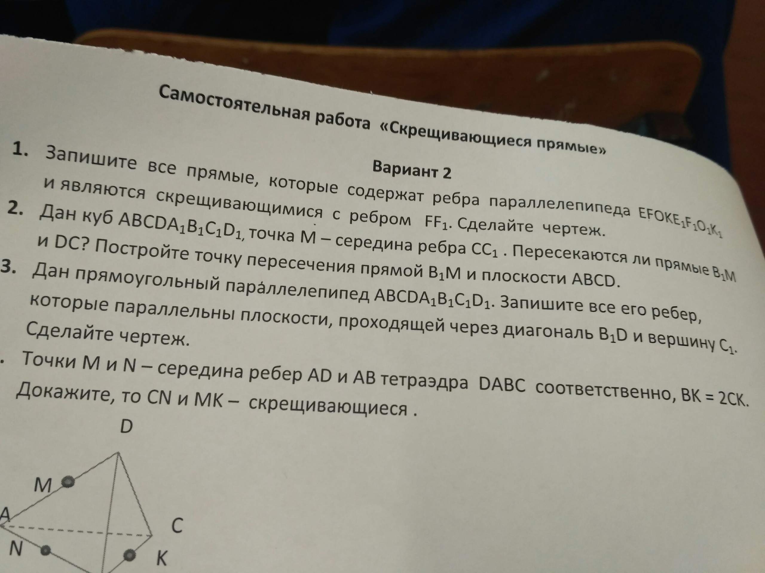 4)прямая СN лежит в пл-ти АСВ, а прямая АМ пересекает эту пл-ть в точке, не лежащей на этой прямой,значит они скрещ-ся