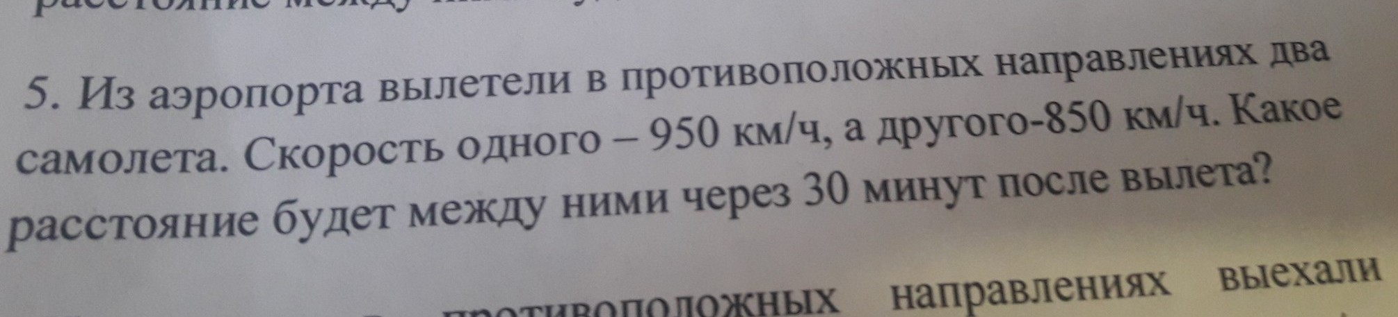 из аэропорта вылетели в противоположных направлениях два самолета Скорость одного 950 км ч а другого 850 км ч Какое расстояние будет между ними через 30 минут после вылета