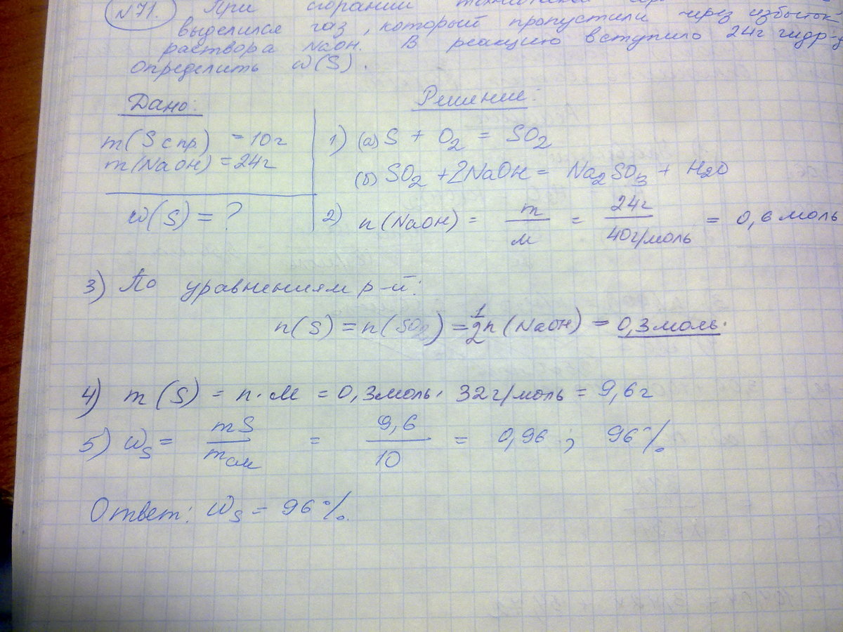 Помогите пожалуйста!!!!! При сгорании технич серы массой 10 г выделился газ, который пропустили через избыток раствора гидроксида натрия. В реакцию вступили гидроксид натрия 24 г . Определить массовую долю серы в технич сере??