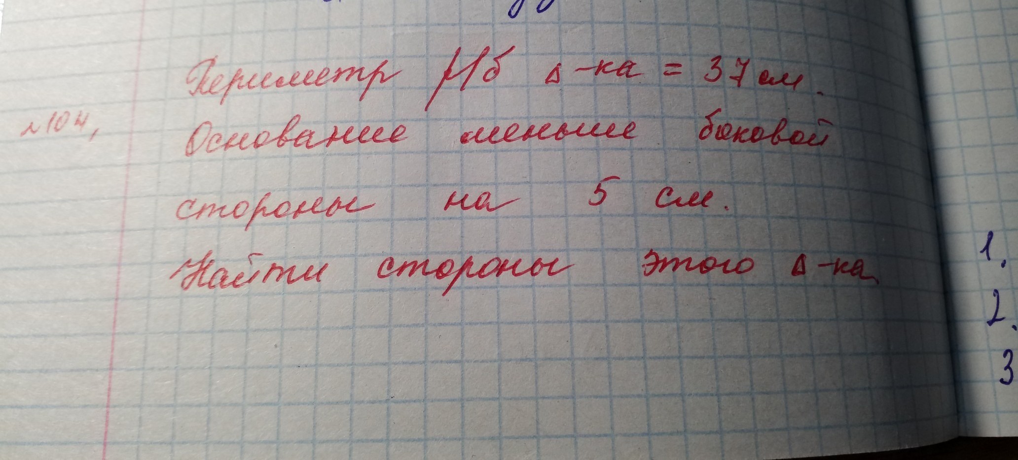 Пусть х боковая сторона, а х-5 (см) основание , значит х+х-5=37