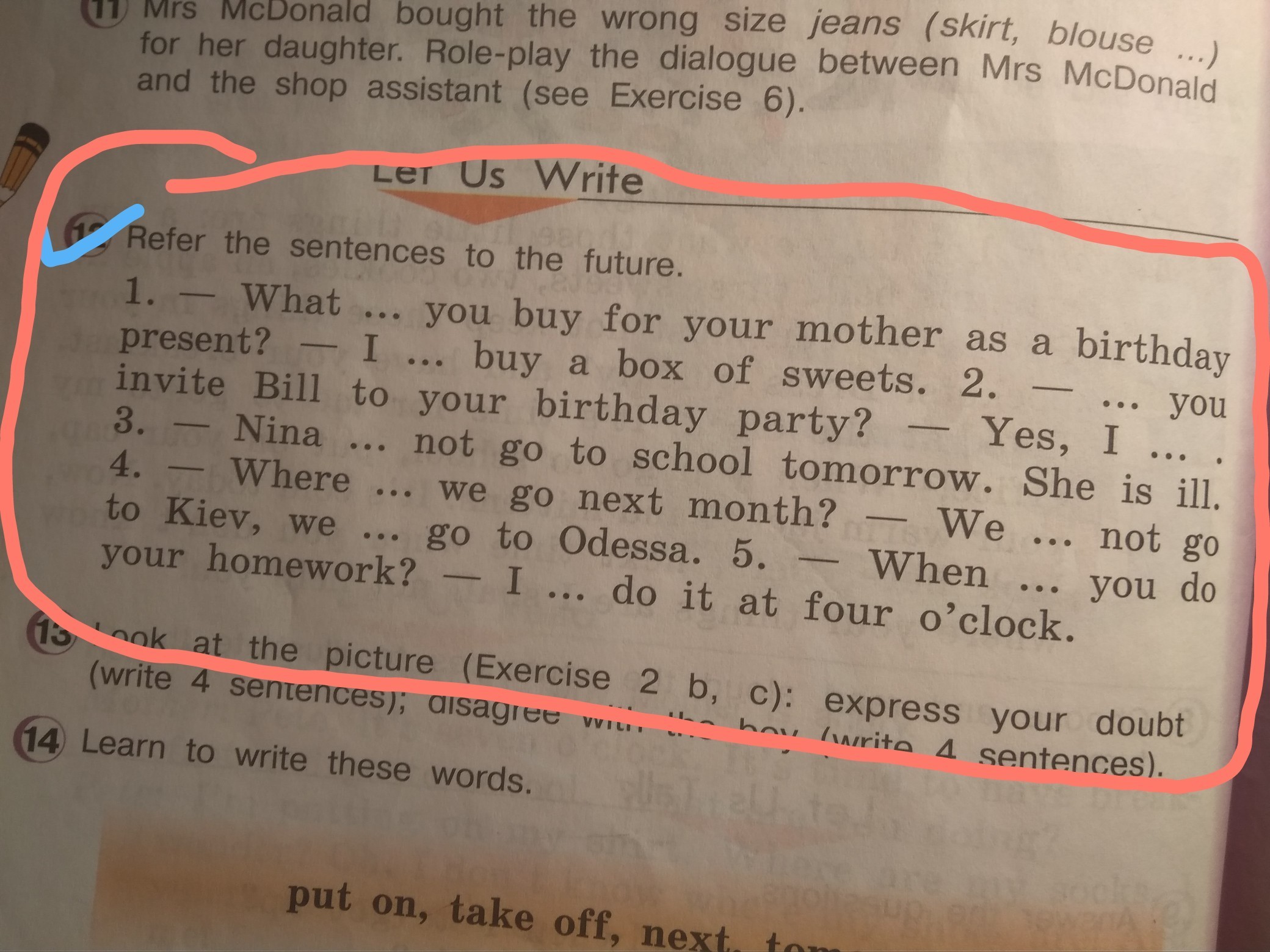1)-Что ты купишь для своей мамы как подарок на день рождения? - я куплю коробку с конфетами.
