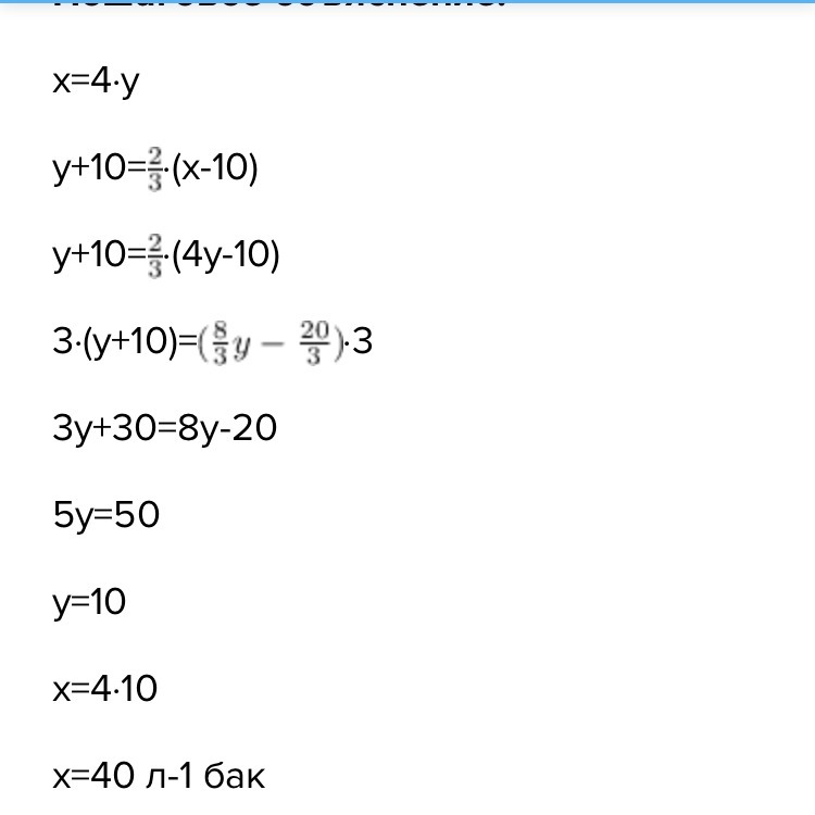 Это уравнение решается методом подстановки. Здесь х=4y,значит чтобы решить уравнение с двумя переменными,нужно одну заменить на другую.В данном случае х заменяют на y.Затем,чтобы получилось целое число и удобнее было считать,домножают обе части на 3.Переменные переносят в одну сторону,а числа в другую с противоположным знаком.То есть 3y-8y= -20-30,получается -5y= -50.Так как минус на минус даёт плюс,они сокращаются,и получается простое уравнение 5y=50.Дальше мы 50 делим на 5 и получаем 10-это переменная y.Нам нужно найти ещё переменную х. Подставляем получившееся значение y в уравнение х=4y и получаем 40.