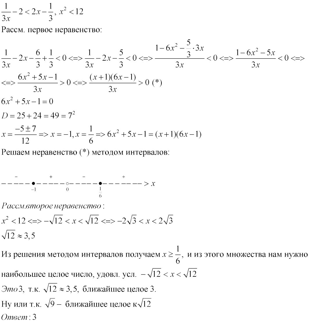 1//3х - 2 < 2x - 1//3 , удовлетворяющее неравенству х^2 < 12