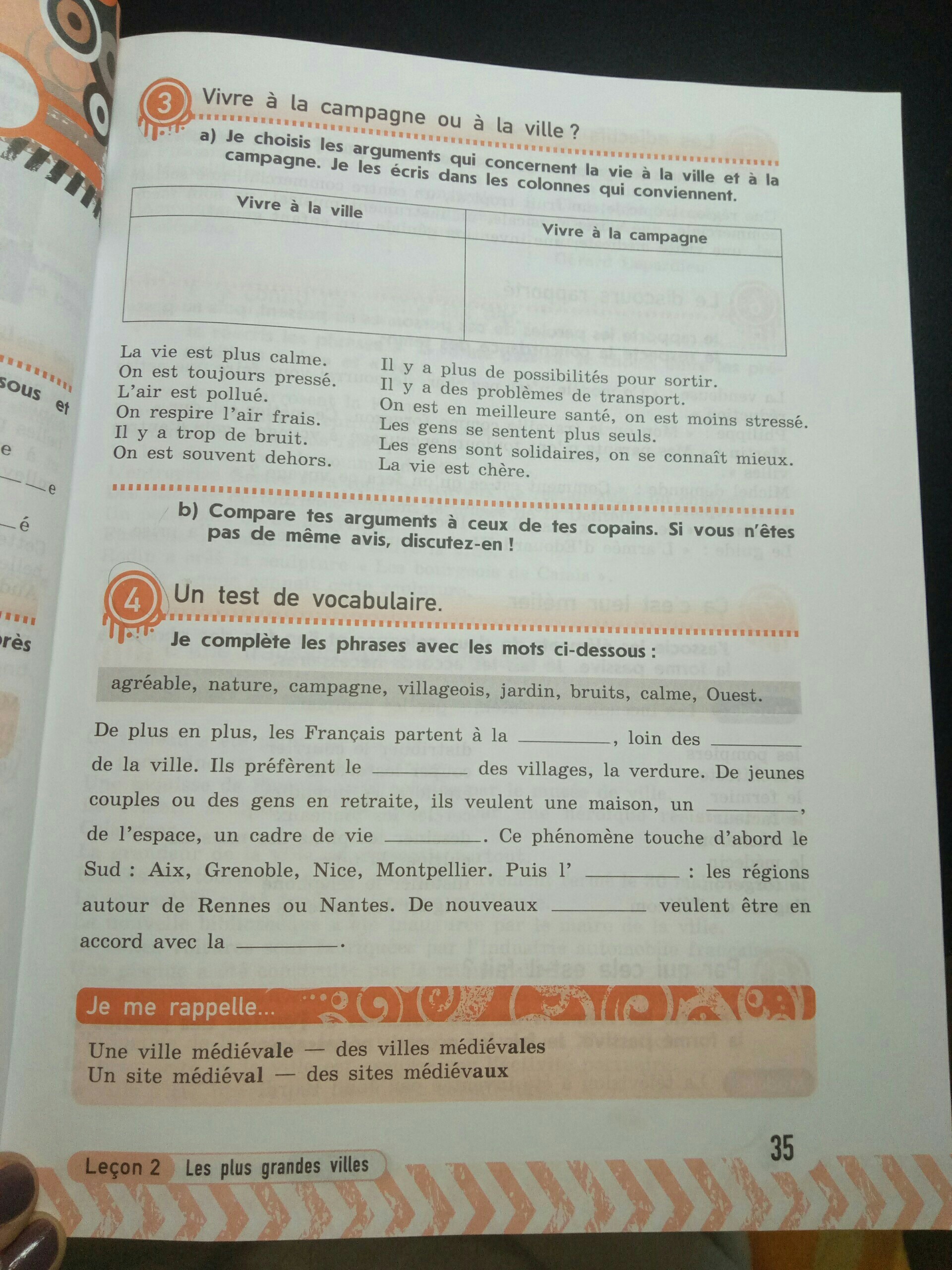 à la ville: On est toujours pressé. L'air est pollué. Il y a trop de bruit. Il y a plus de possibilités pour sortir. Les gens se sentent plus seuls. La vie est chère.