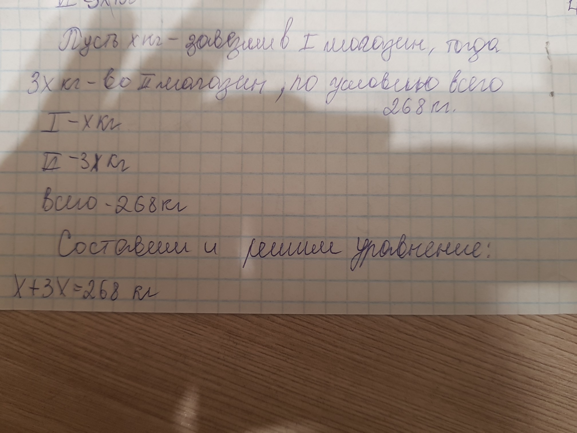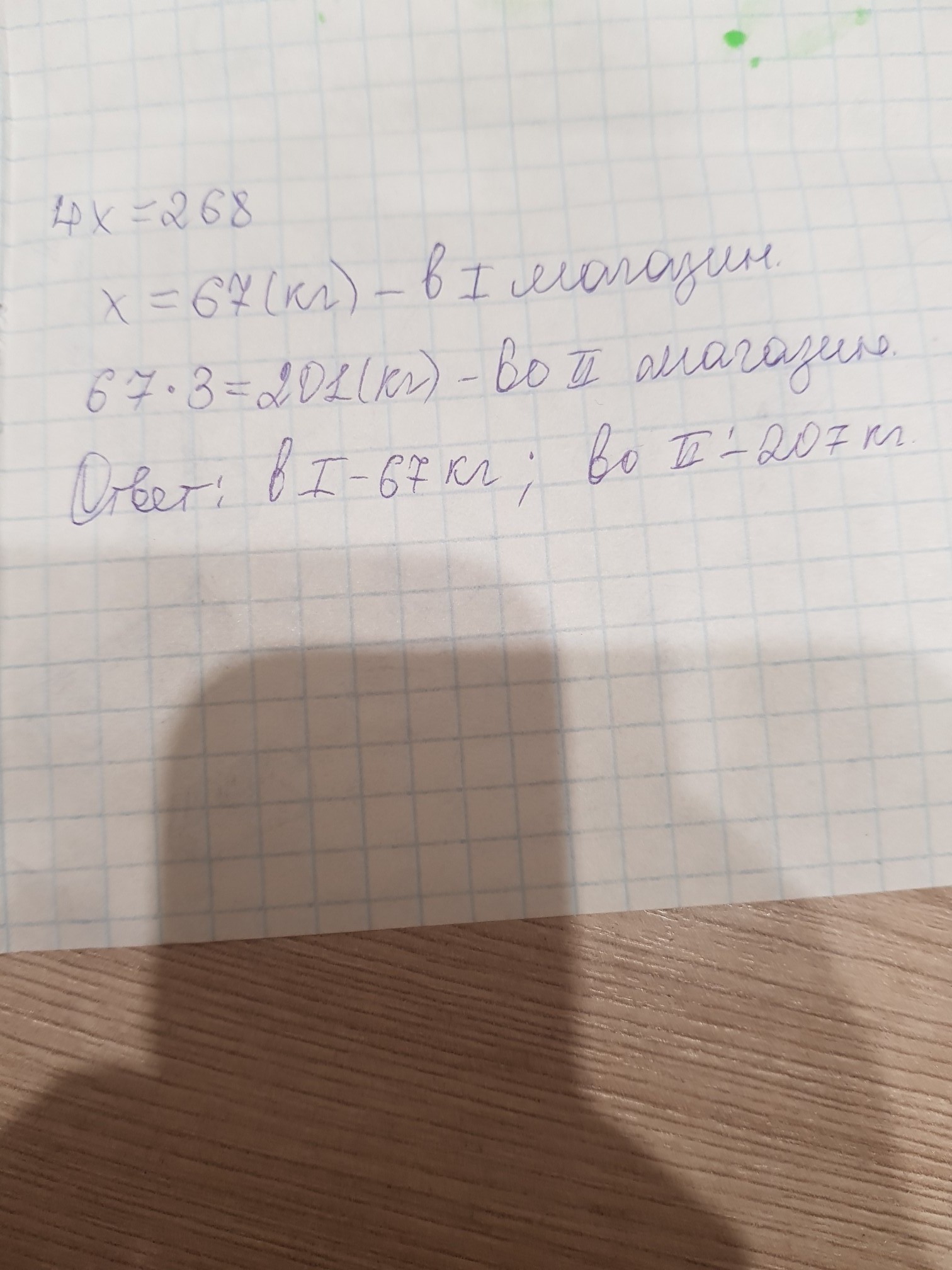В два магазина завезли 268 кг шампиньонов причем в первый магазин завезли шампиньонов в 3 раза меньше чем во второй Сколько килограммов шампиньонов завезли в каждый магазин Можно пожалуйста решить это решение ими действиями