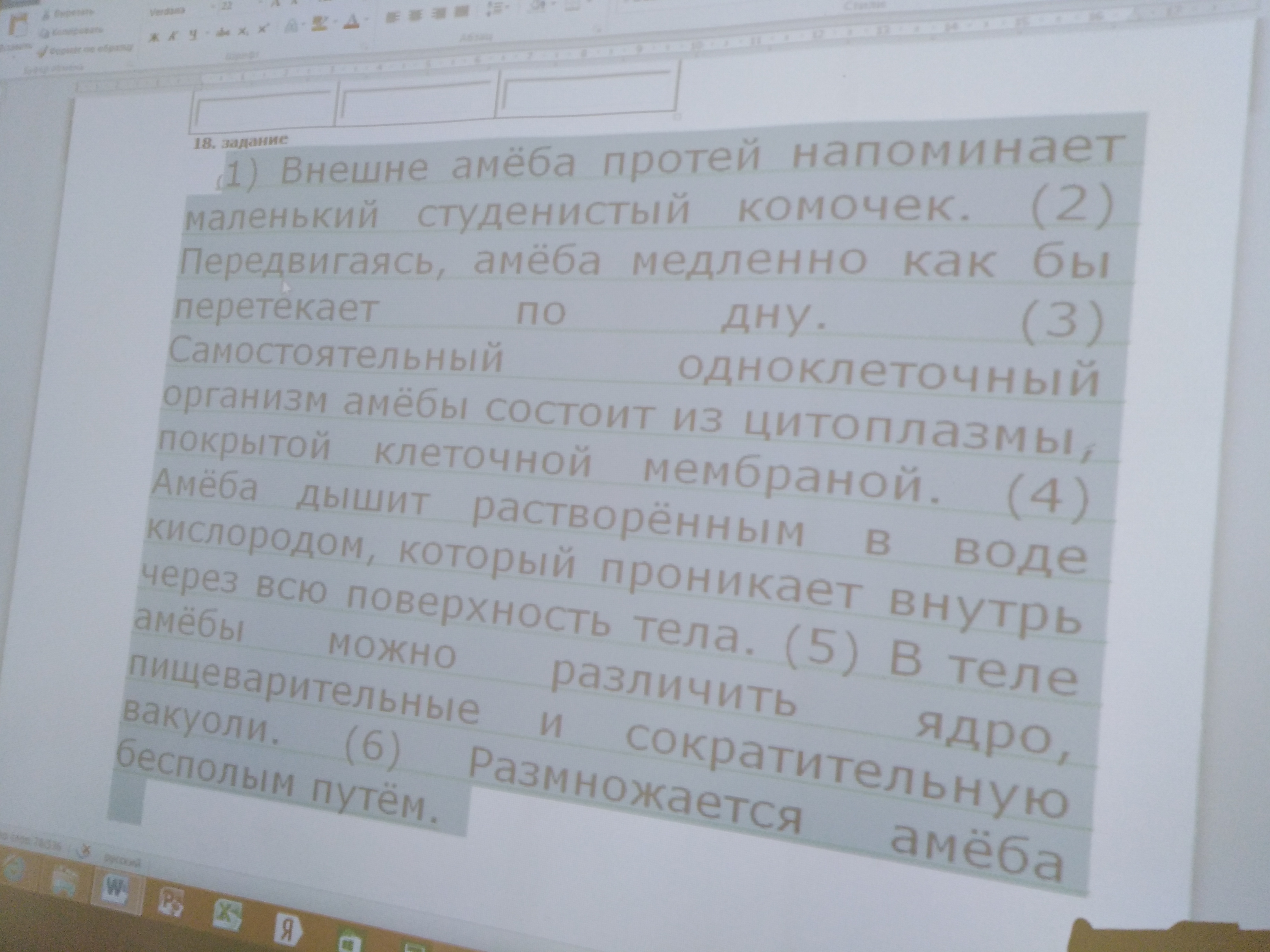 (1) Внешне амёба протей напоминает маленький студенистый комочек. (2) Передвигаясь, амёба медленно как бы перетекает по дну. (3) Самостоятельный одноклеточный организм амёбы состоит из цитоплазмы, покрытой клеточной мембраной.