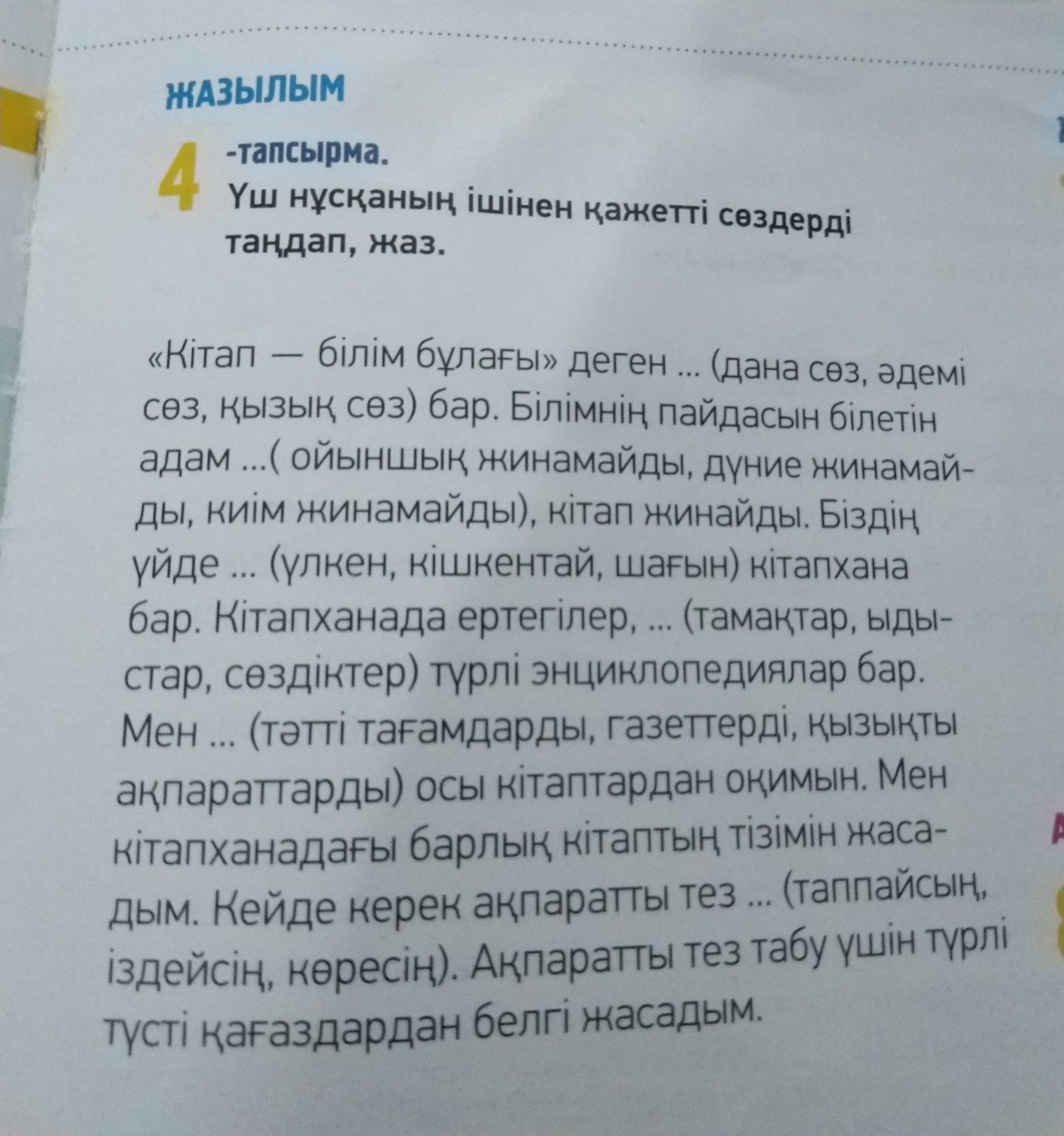 Кітап ,,білім бұлағы,, деген дана сөз бар.Білімнің пайдасын білетін адам дүние жинамайды, кітап жинайды.Біздің үйде шағын кітапхана бар.Кітапханада ертегілер ,сөздіктер түрлі энциклопедиялар бар.Мен қызықты ақпараттарды осы кітаптардан оқимын.Мен кітапханадағы барлық кітаптың тізімін жасадым.Кейде керек ақпараты тез таппайсын.Ақпаратты тез табу үшін түрлі түсті қағаздардан белгі жасадым.