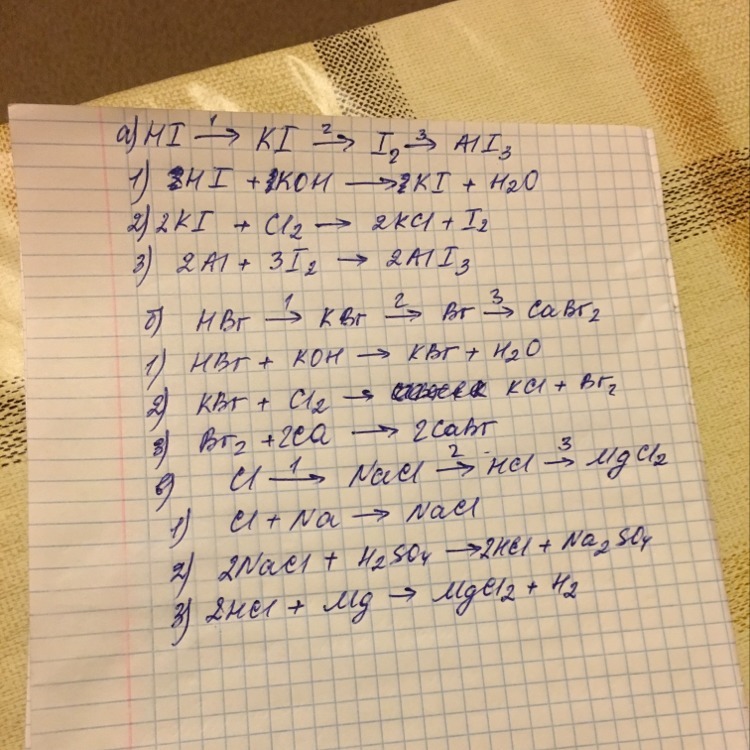 написать уравнения реакций, соответствующих цепочкам превращений: а) иодоводородная кислота → иодид калия → иод → иодид алюминия б) бромоводородная кислота → бромид калия → бром→ бромид кальция в) хлор → хлорид натрия → хлороводород → хлорид магния