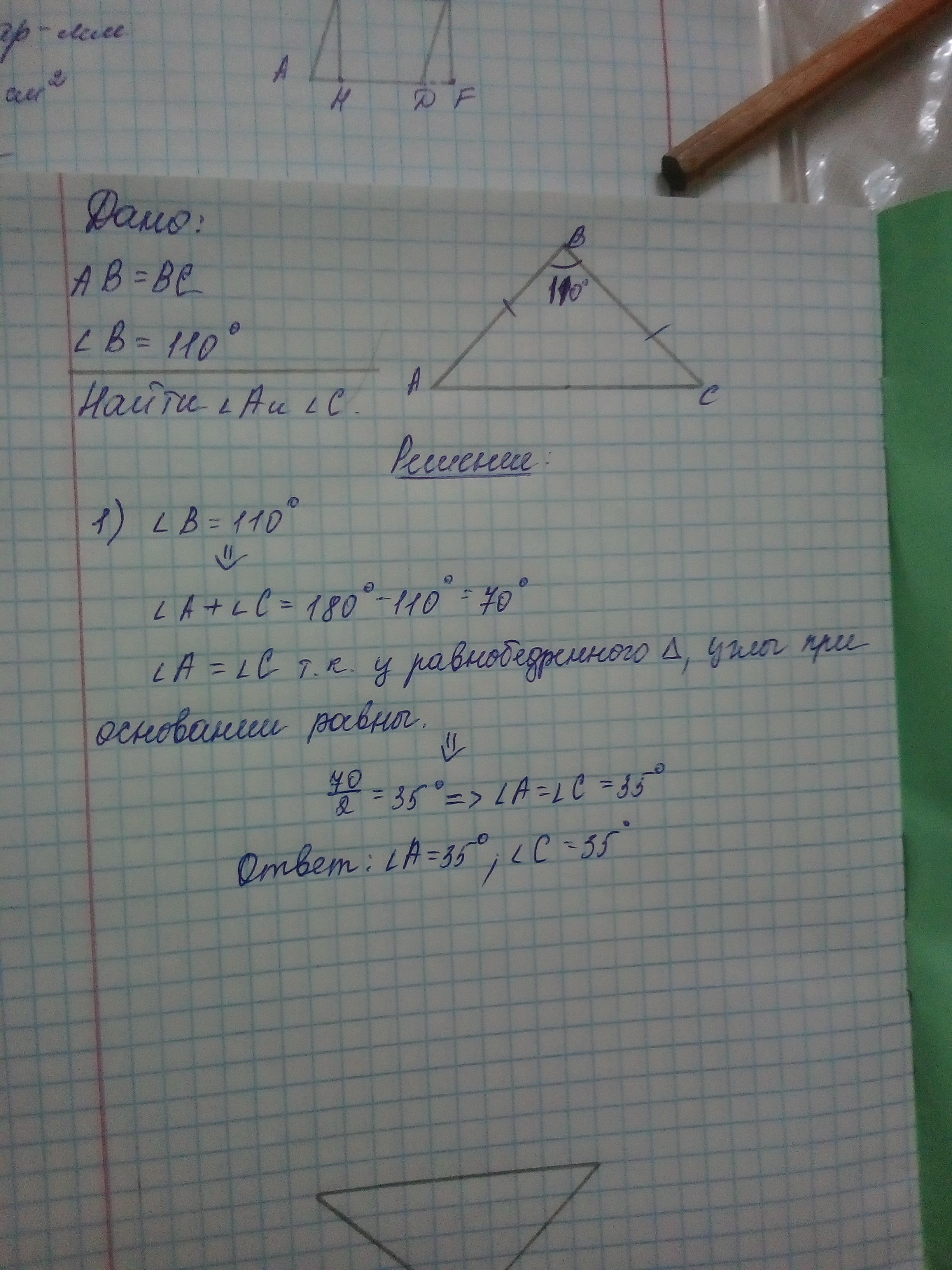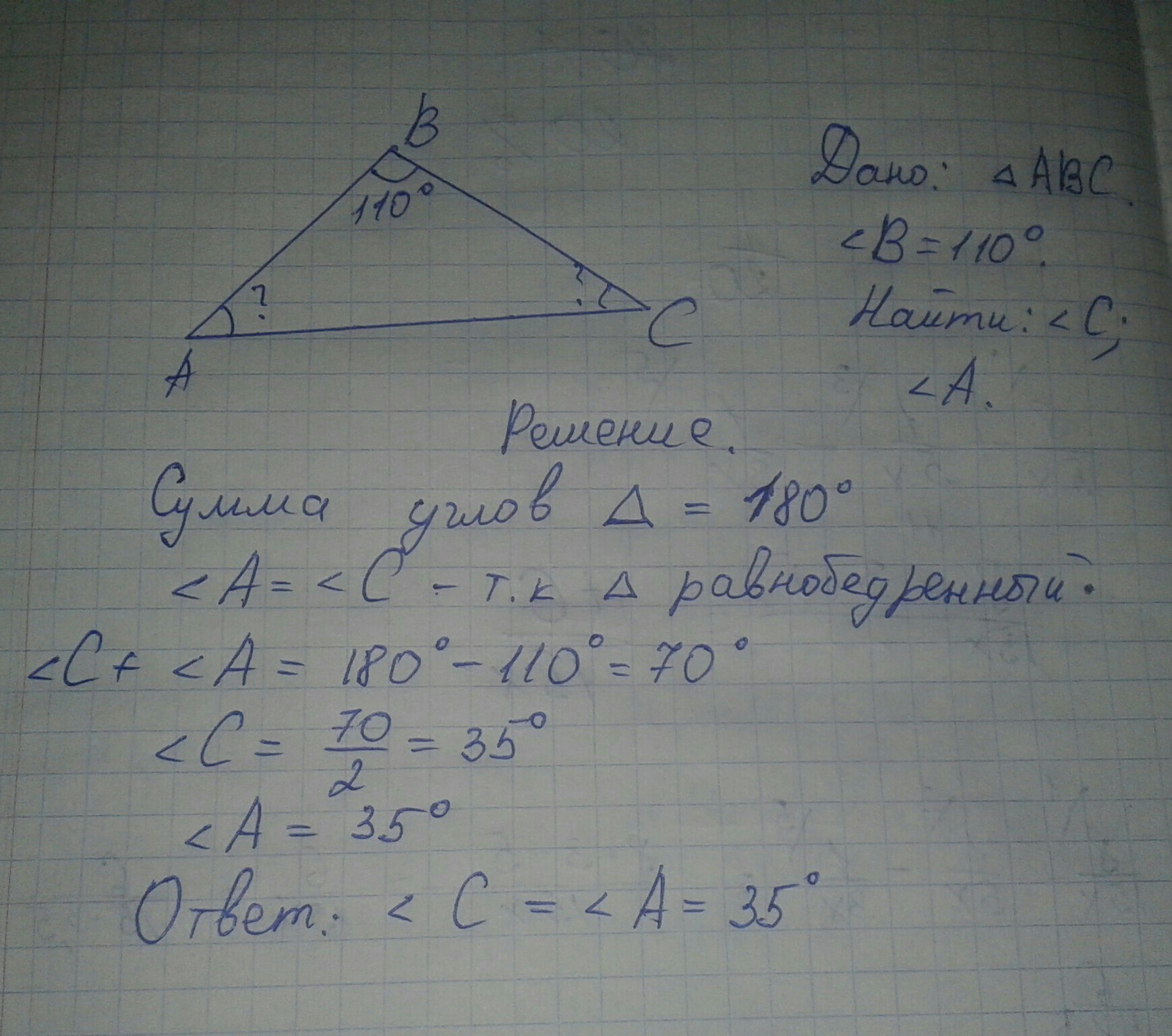 В равнобедренном треугольнике угол, противолежащий основанию равен 110 градусов.Найти углы при основании.