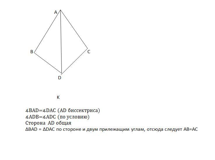 Луч AD-биссектриса угла A. На сторонах угла A отмечены точки B и C так, что угол ADB = углу ADC. Докажите что AB=AC. С чертежом плиз