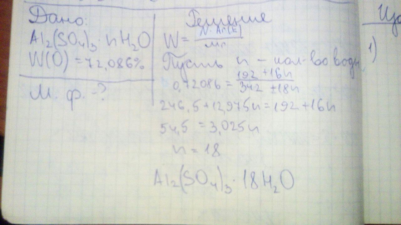 Определите молекулярную формулу кристаллогидрата сульфата алюминия, если массовая доля кислорода в нем составляет 72,086%.