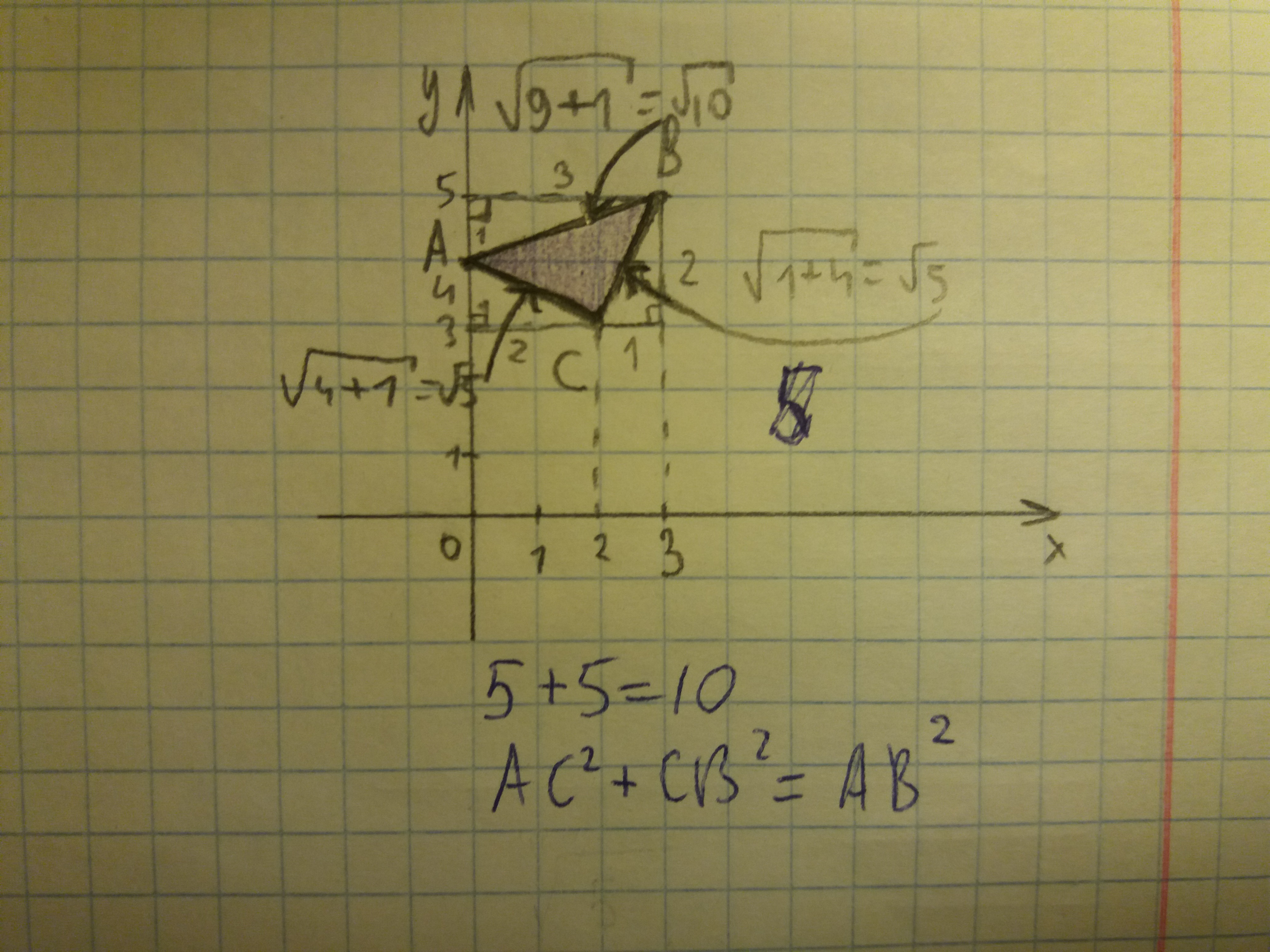 Построим по координатам, найдём длины сторон треугольника. Проверка показывает, что АС2+СВ2=АВ2, зн. треугольник прямоугольный