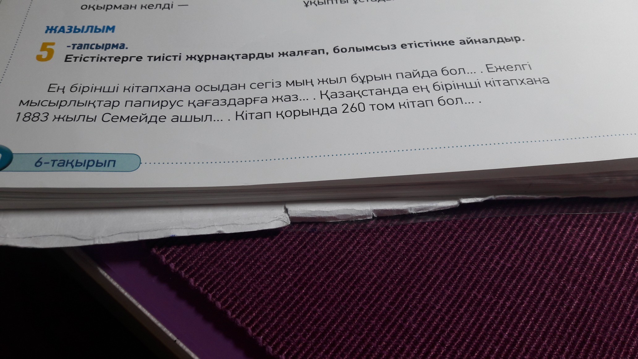 ең бірінші кітапхана осыдан сегіз мың жыл бұрын пайда болды.ежелгі мысырлықтар папирусқағаздарға жазды.қазақстанда ең бірінщі кітапхана 1883 жылы семейде ашылды.кітап қорында260 том кітап болды