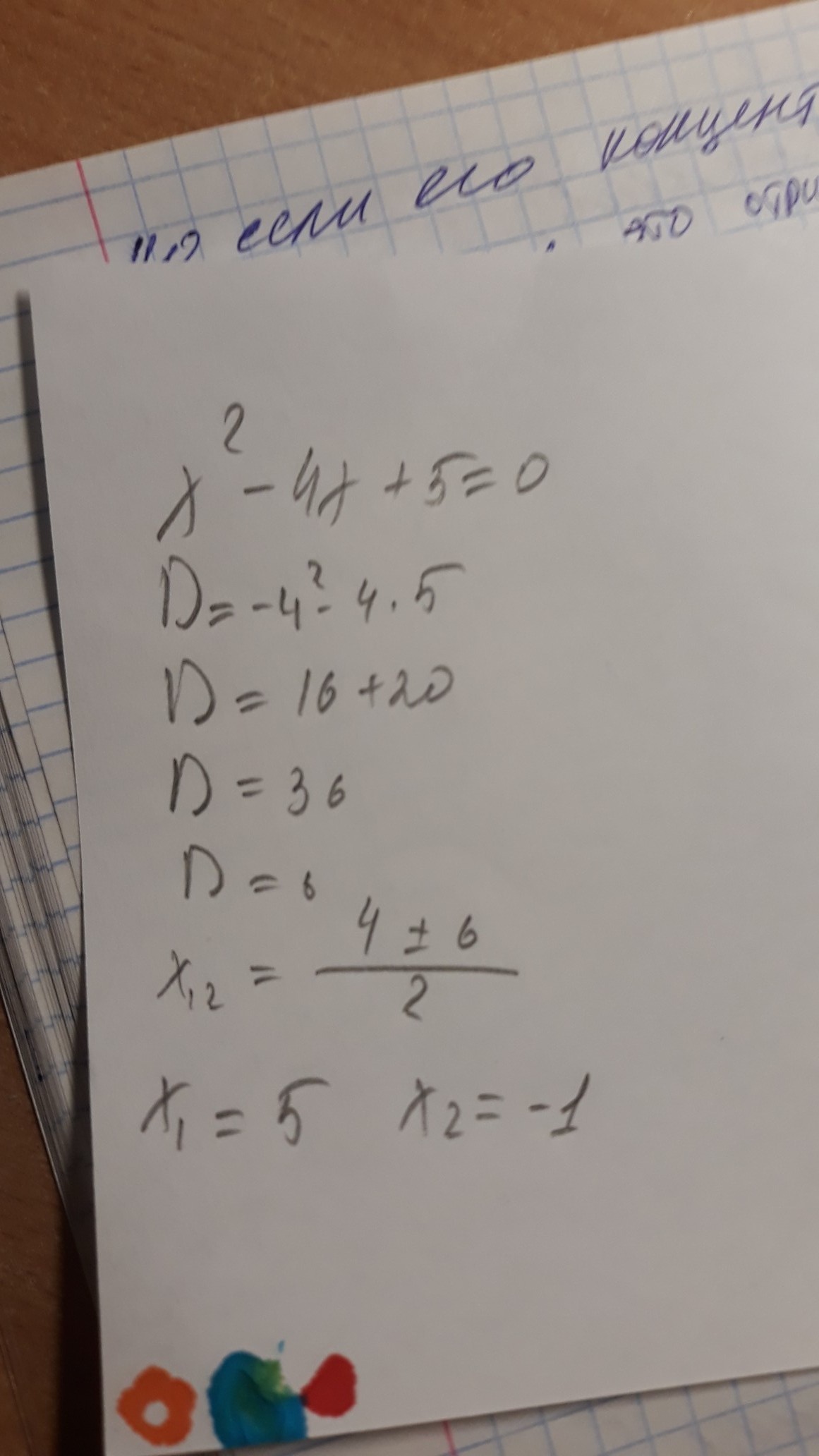 Д=(-4)^2-4*1*5=16-20=-4 - ответ корней нет