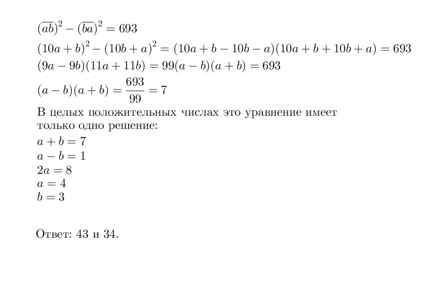 Разность квадратов двух двузначных чисел, записанных одними и теми же цифрами, ровна 693. Найдите эти числа