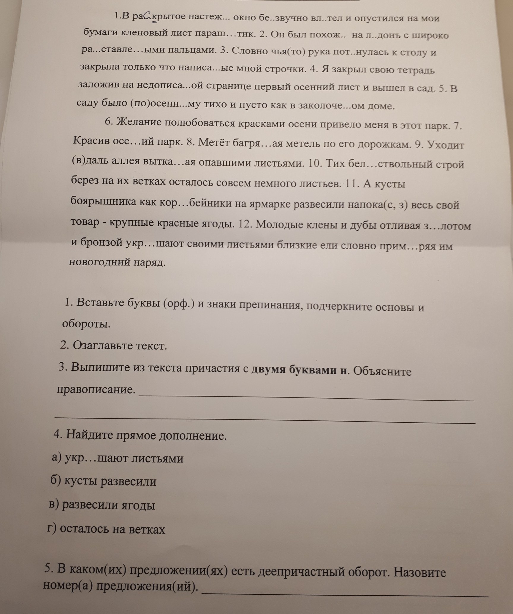 1. В раскрытое настежь окно беззвучно влетел и опустился на мои бумаги кленовый лист-парашютик. 2. Он был похож на ладонь с широко расставленными пальцами. 3.Словно чья-то рука потянулась к столу и закрыла только что написанные мной строчки. 4. Я закрыл свою тетрадь, заложив на недописанной странице первый осенний лист, и вышел в сад. 5. В саду было по-осеннему тихо и пусто, как в заколоченном доме. 6. Желание полюбоваться красками осени привело меня в этот парк. 7.Красив осенний парк. 8. Метет багряная метель по его дорожкам. 9.Уходит вдаль аллея, вытканная опавшими листьями. 10.Тих белоствольный строй берез, на их ветках осталось совсем немного листьев. 11. А кусты боярышника, как коробейники на ярмарке, развесили напоказ весь свой товар - крупные красные ягоды. 12. Молодые клены и дубы, отливая золотом и бронзой, украшают своими листьями близкие ели, словно примеряя им новогодний наряд.