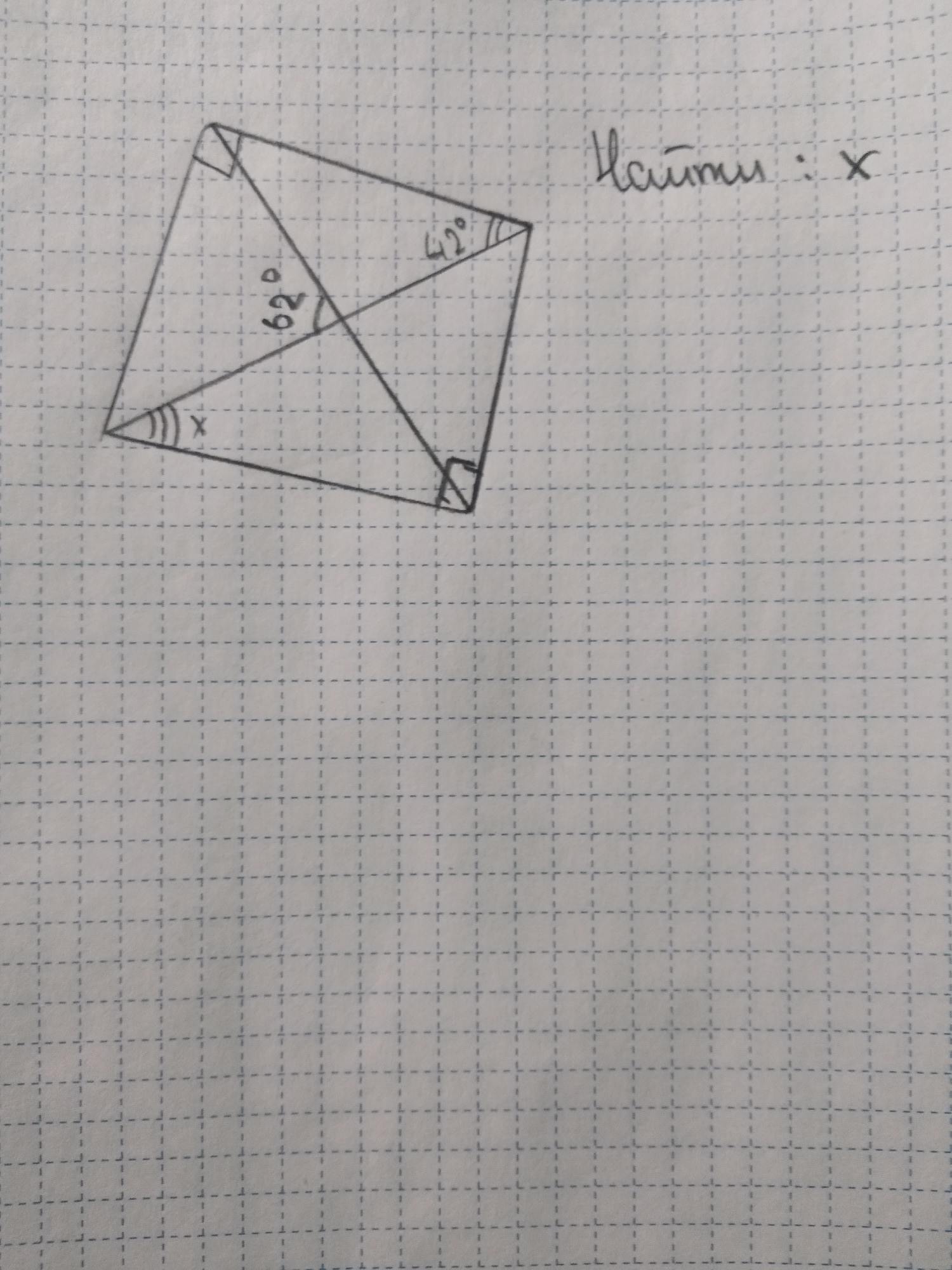 угол против того, что 62 градуса, (у тебя букв то нет) тоже будет 62 по свойству вертикальных, а другие 2 тогда по 118. Значит, в треугольнике который сверху, сумма углов 118+42 и до 180 еще 20. дальше легко найти, смежный с ним 70, в треугольнике слева снова через сумму, смежный с х 70, и тогда сам х 20. Без обозначений сложно обьяснять