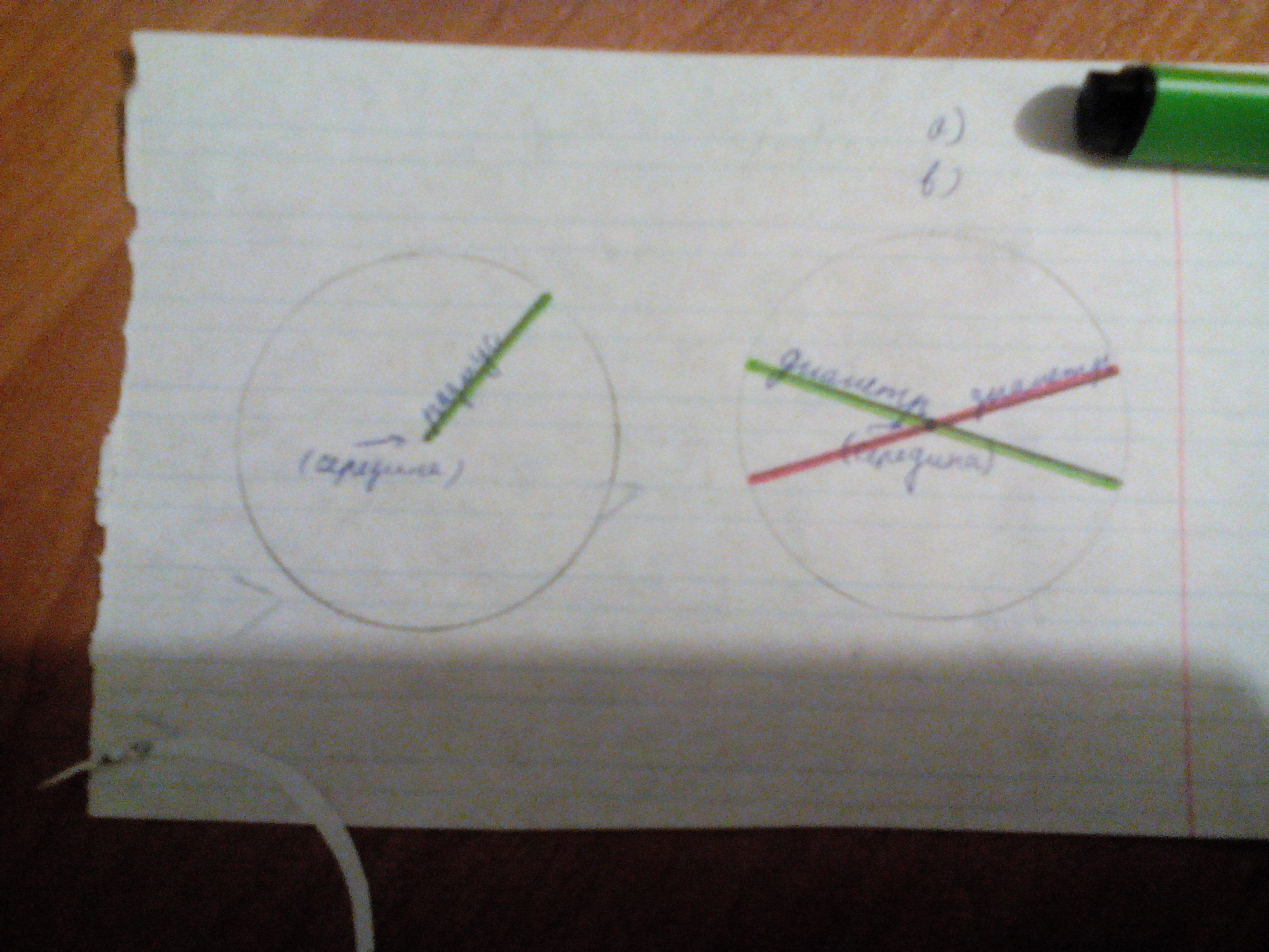 диаметр этого целый Круг Просто измеряешь его от начала до конца. просто вот линию проводишь. Чтобы получился полукруг и измеряешь. а радиус Это половина диамерта, тоесть от середины до любой точки на линии Круга. Вот допустим я покажу тебе на бумаге. Если ты не поймешь, то я не знаю как тебе объяснить